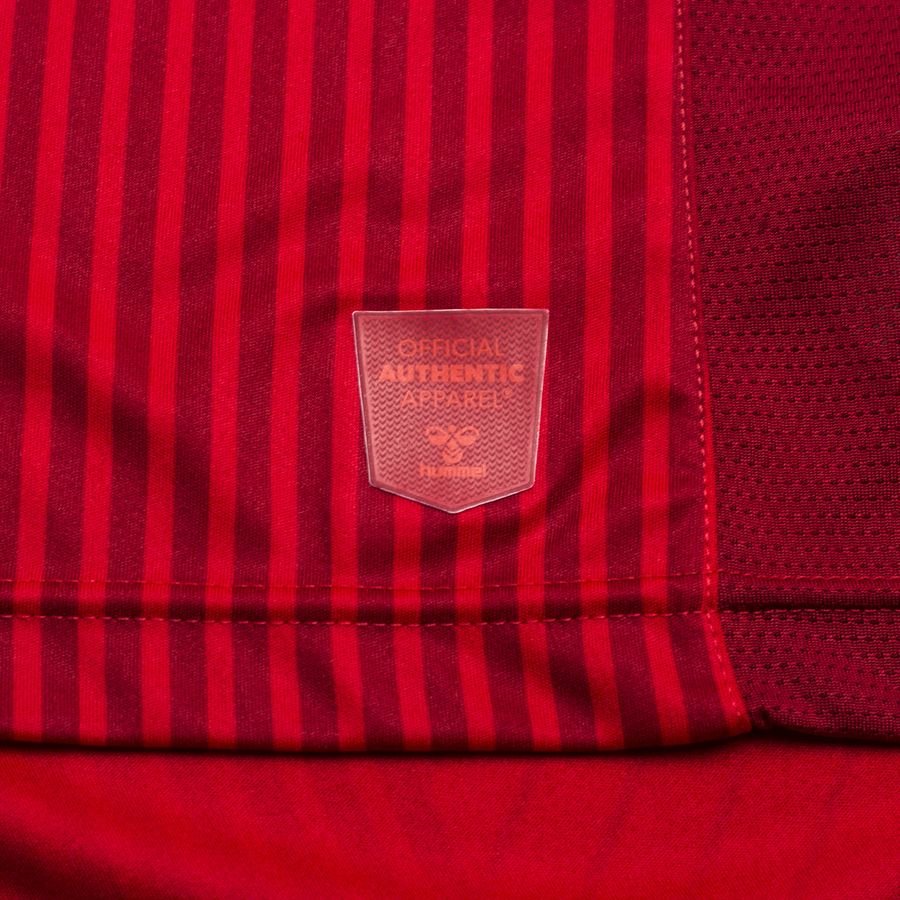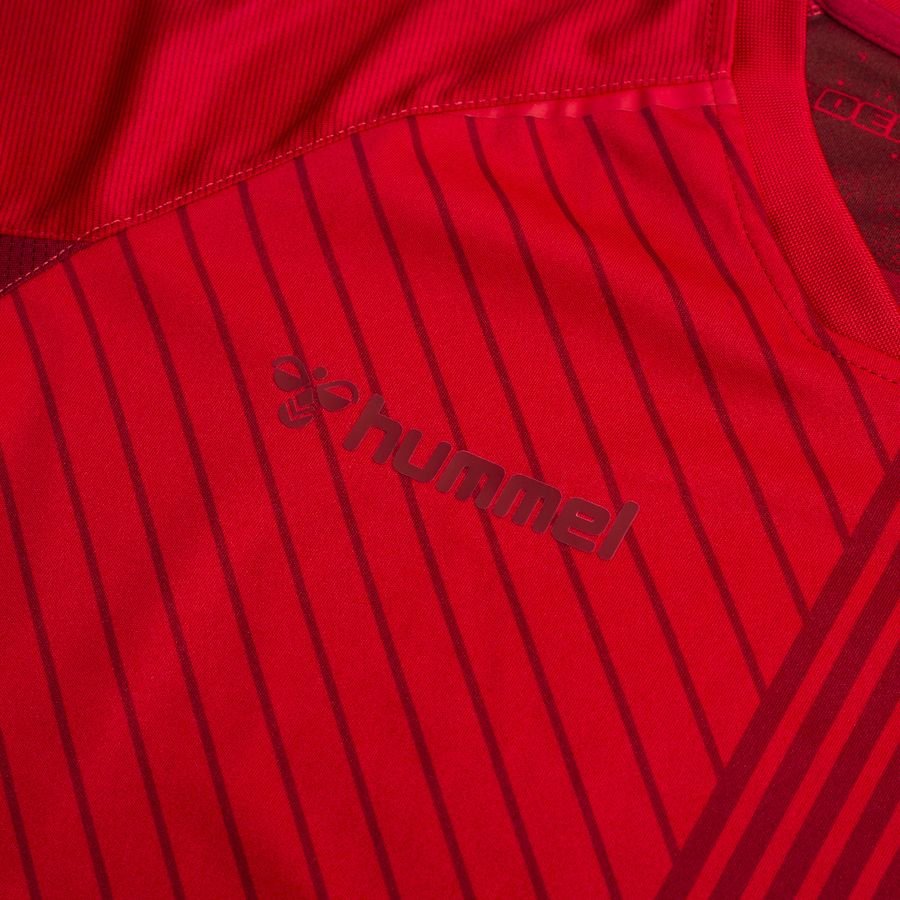 The stripy stylings of the trunk suggest, but don’t photocopy, the famous “Danish Dynamite” design of the 1986 World Cup, while the crest and all Hummel branding appears in red on red.