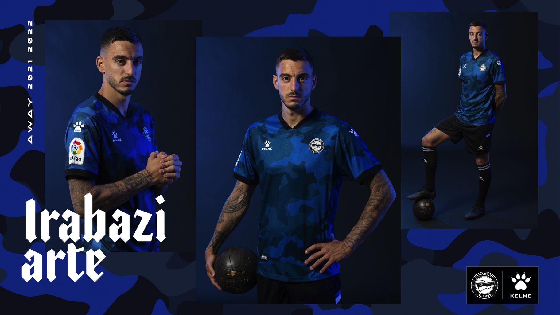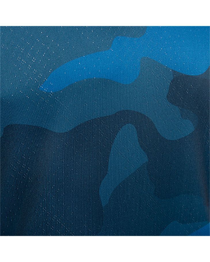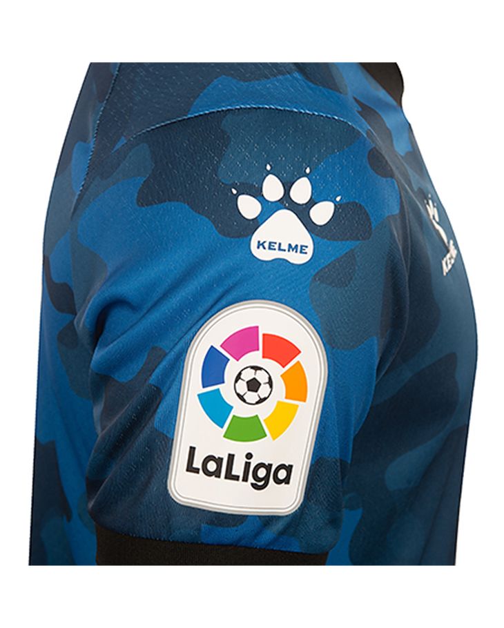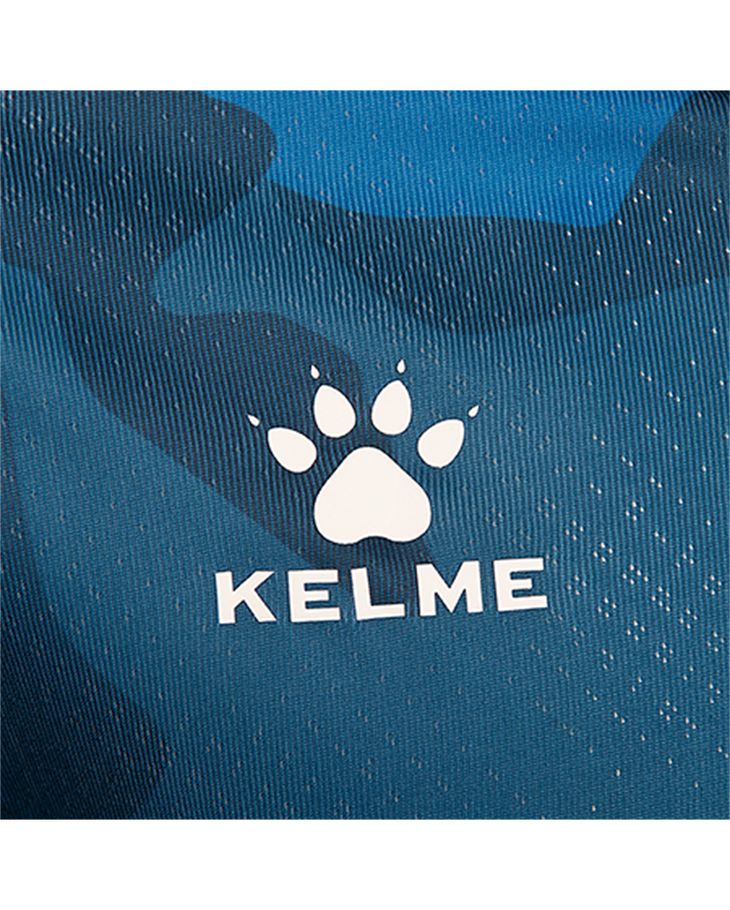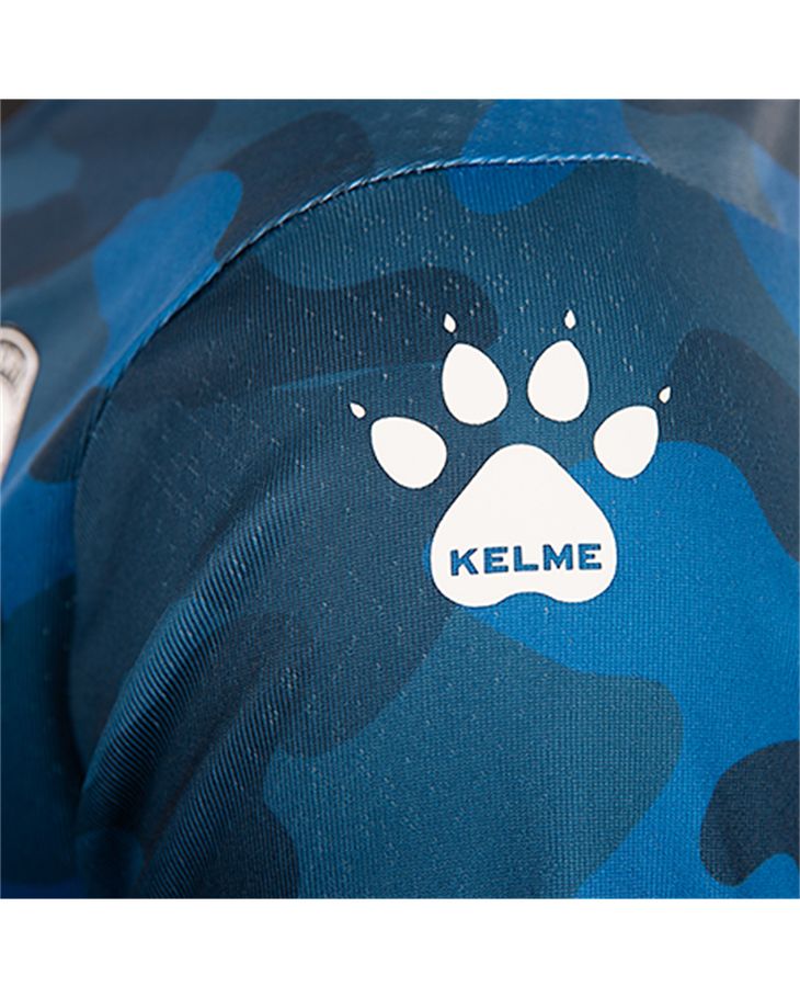 The camouflage-styled design in tones of blue is further embellished with black neck and cuffs, white Kelme logos and crest converted to monochrome.