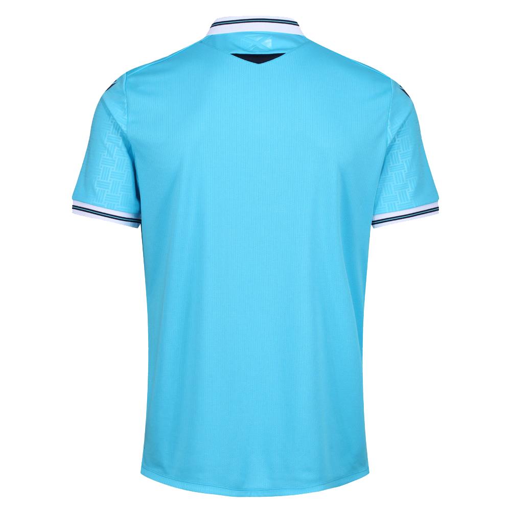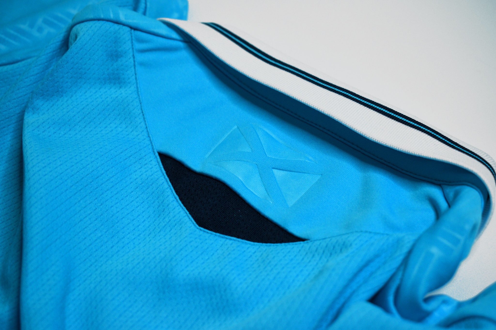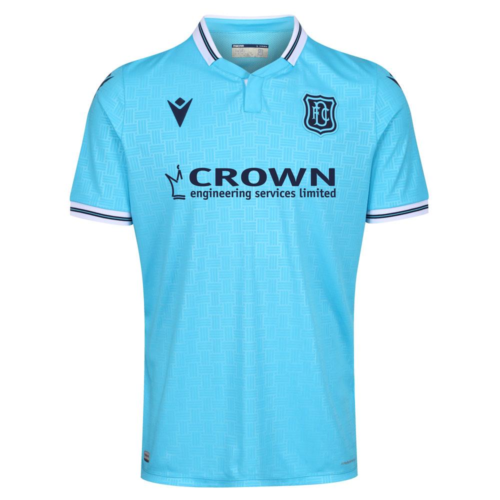 The Macron away jersey of “The Dee” is neon sky blue with a white polo neck decorated by dark and neon sky blue stripes.