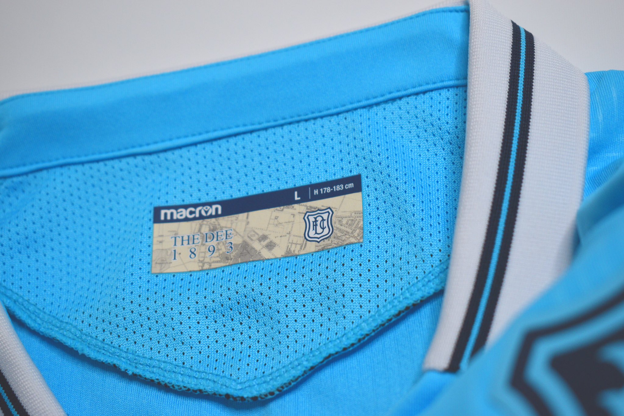The Macron Hero is on the right side of the chest, while the Dundee FC logo appears over the heart on the left. The design of the Scottish national flag is embossed in the back neck with tone-on-tone graphics.