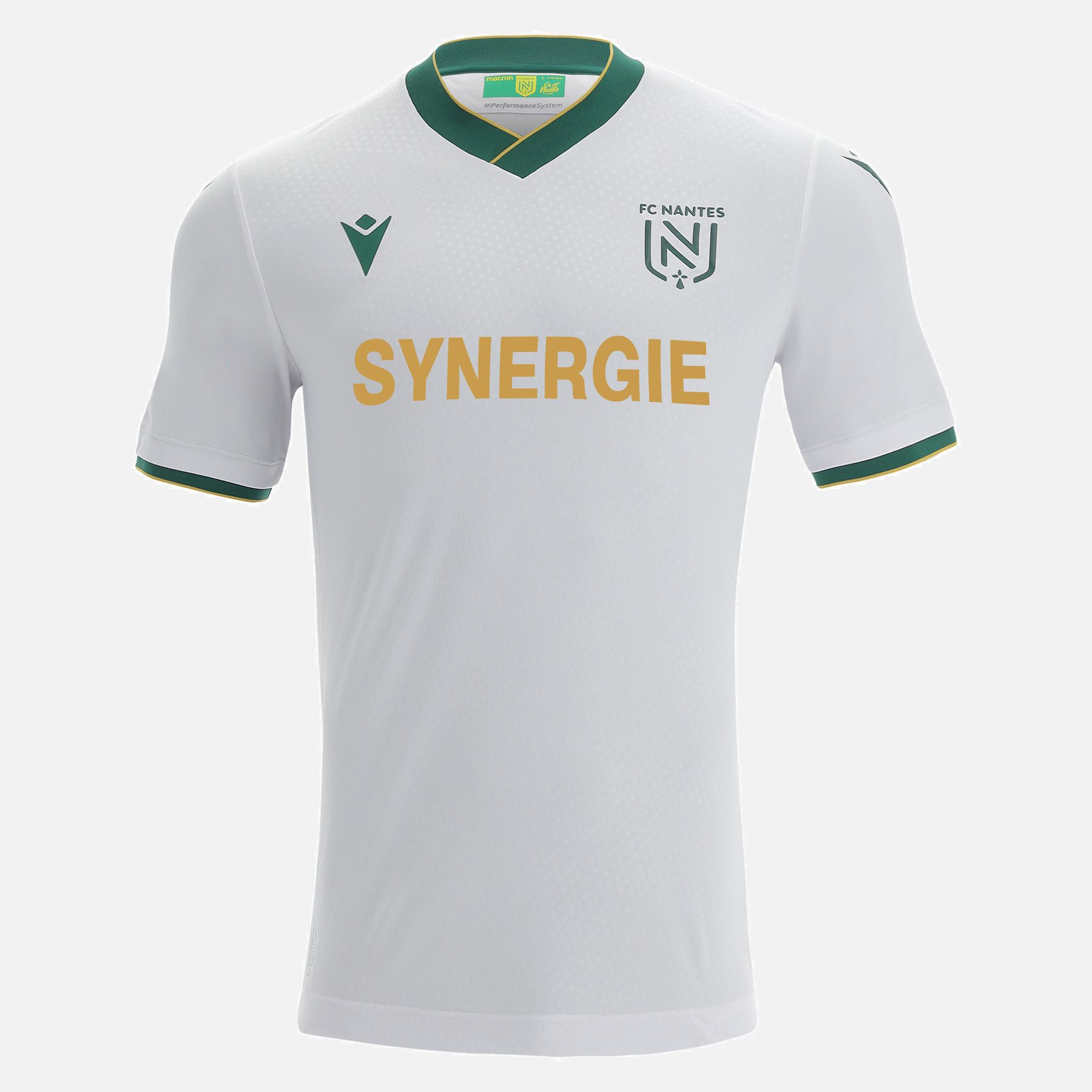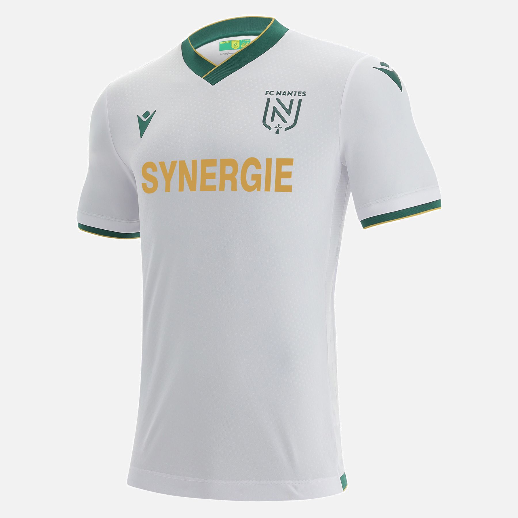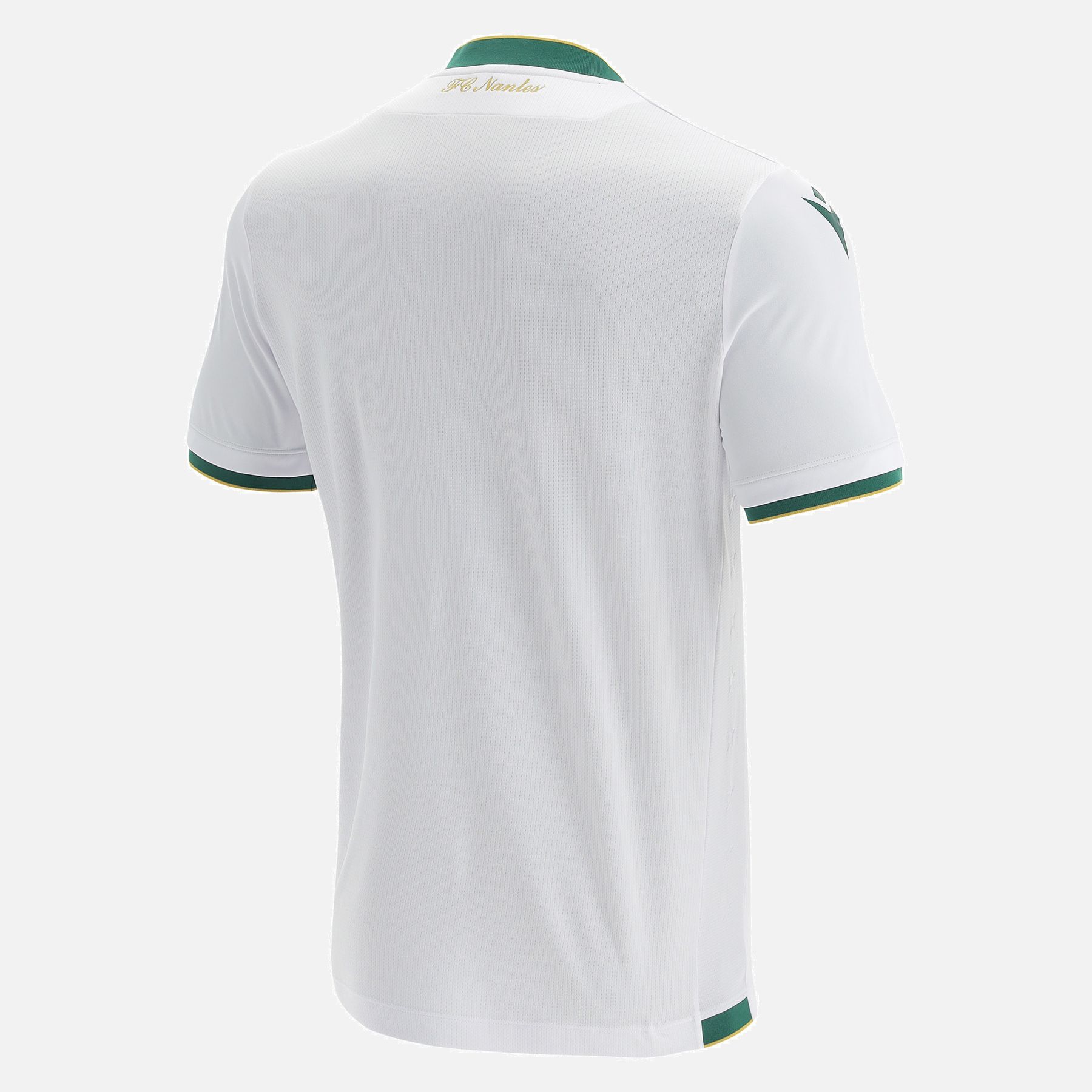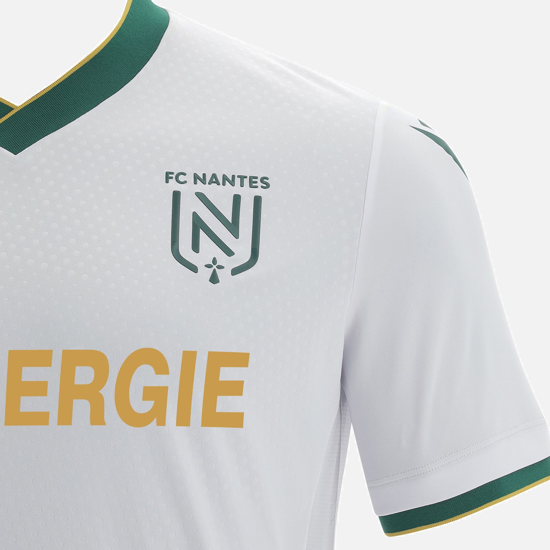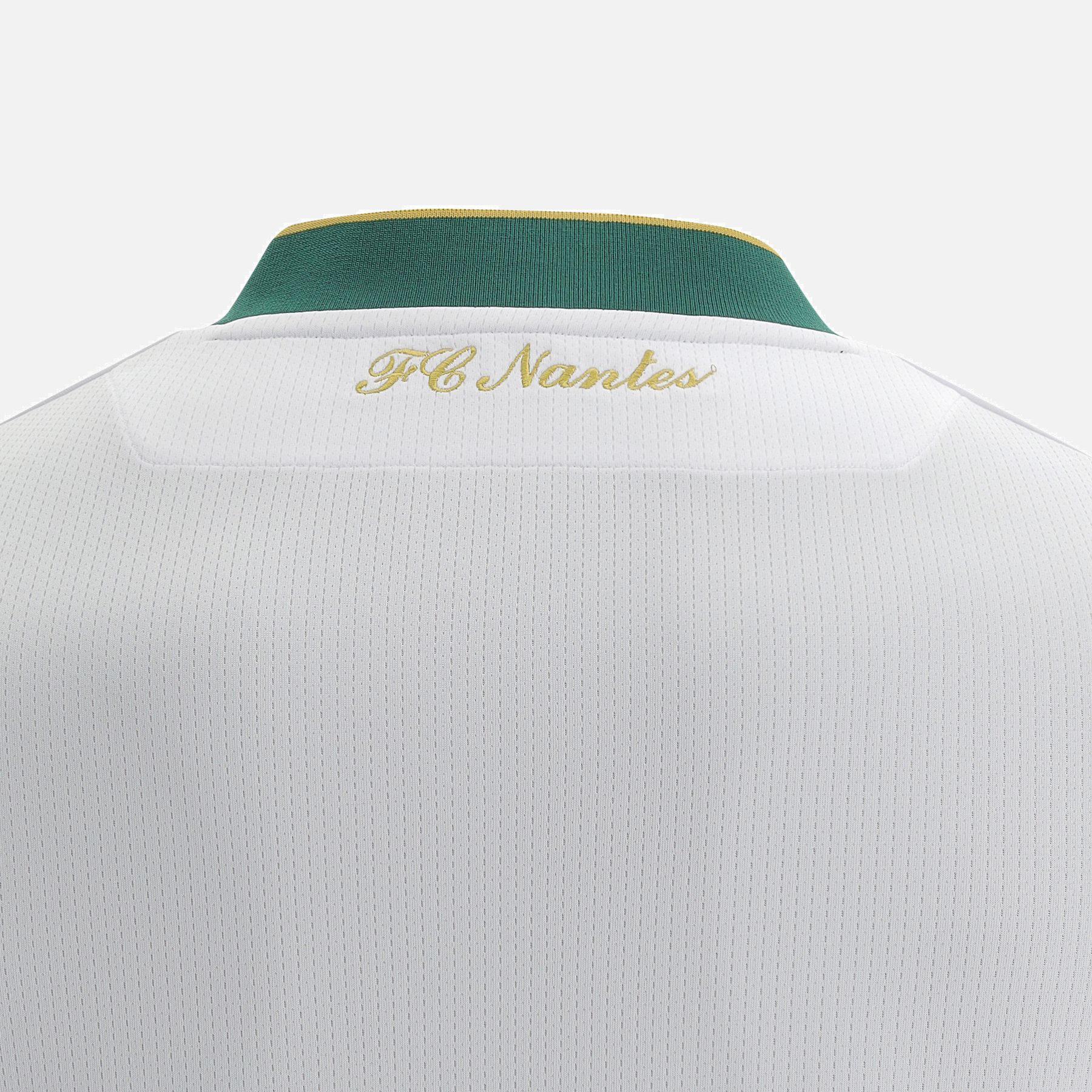 The new Nantes away jersey is white with a V-neck collar featuring green knitted trim, plus a sleek golden stripe. The sleeve trim is also in gold and green, as is the detailing at the bottom of the shirt.