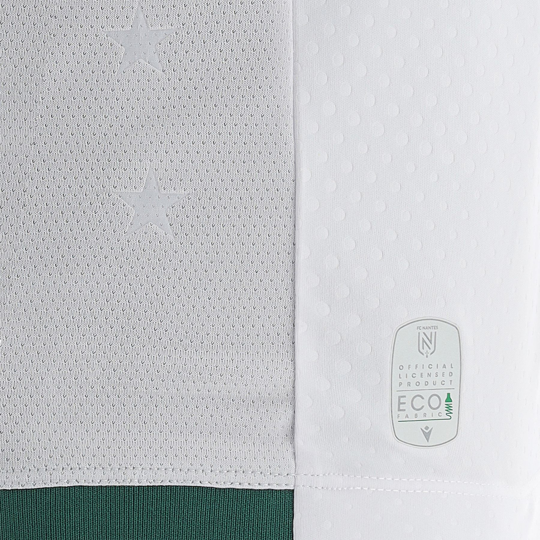 The front of the jersey features a geometric, tone-on-tone design created using an embossed graphic, while the rear of the neck features the club's colours and logos, in addition to the words On est Nantes. A silicone printed Macron Hero logo adorns the right breast, with the FC Nantes crest positioned on the left and the name of the club embroidered in gold at the back of the neck.