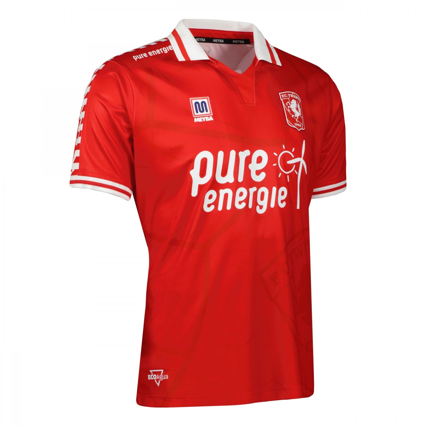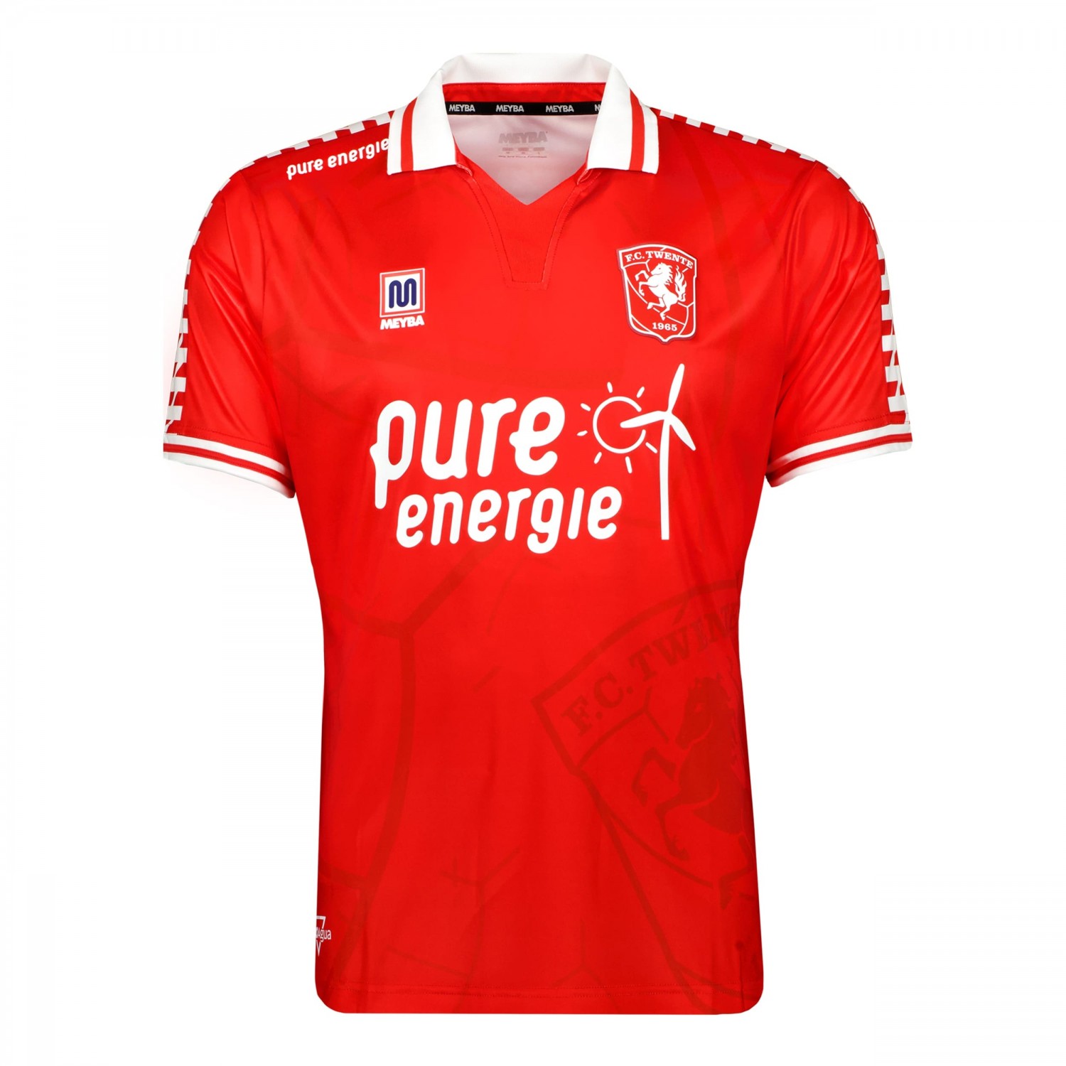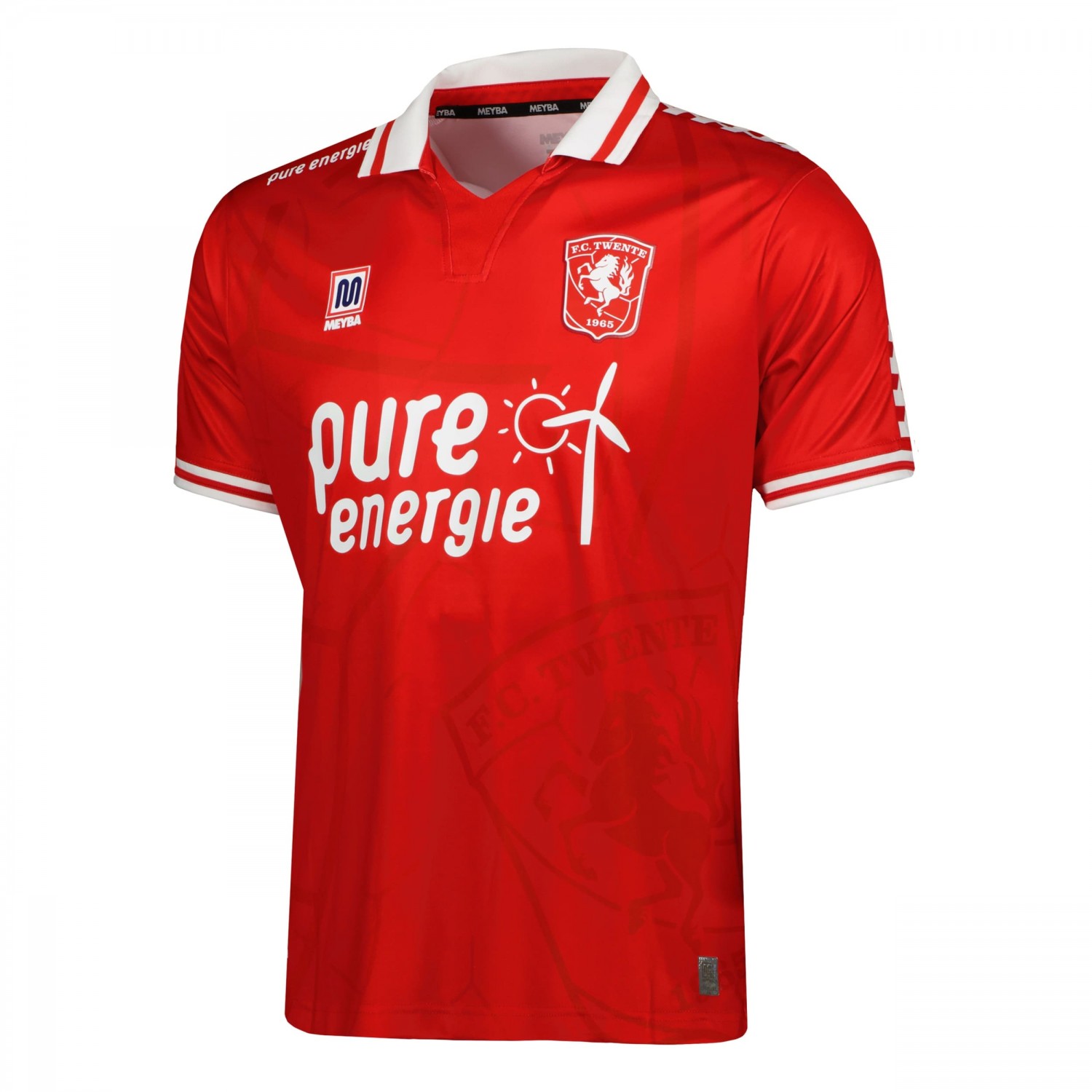The red shirt with white accents carries the chest’s version of the club crest as a full contrast, along with the sponsorship logos, while Meyba’s own logo appears in full colour.
