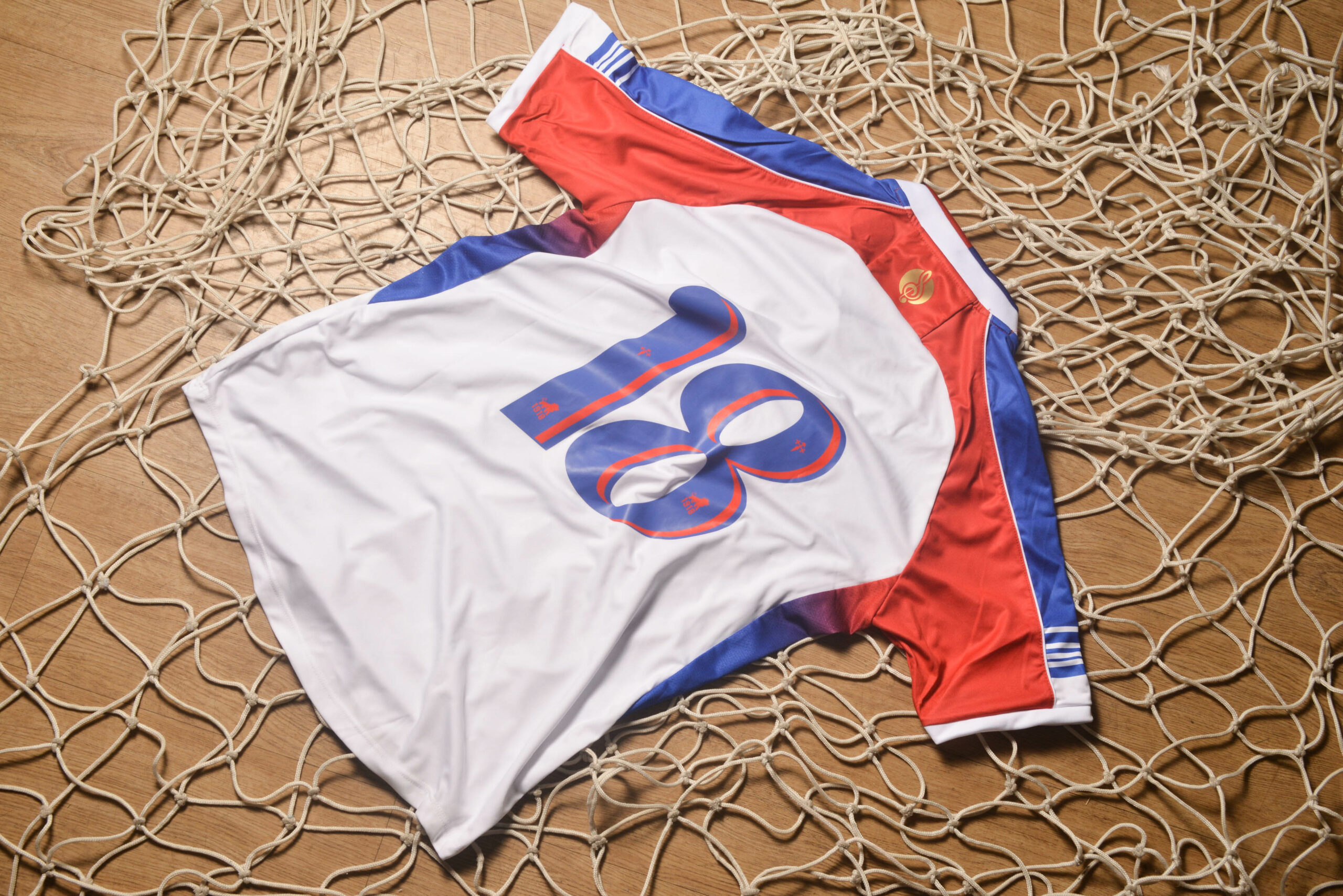 Generally sticking to the tri-coloured look - the white trunk is contrasted with red and blue raglan sleeves - the shirt boasts gradients, curves and abundant decoration, plus the crest in full colour and the logo of ostensible manufacturer “”.