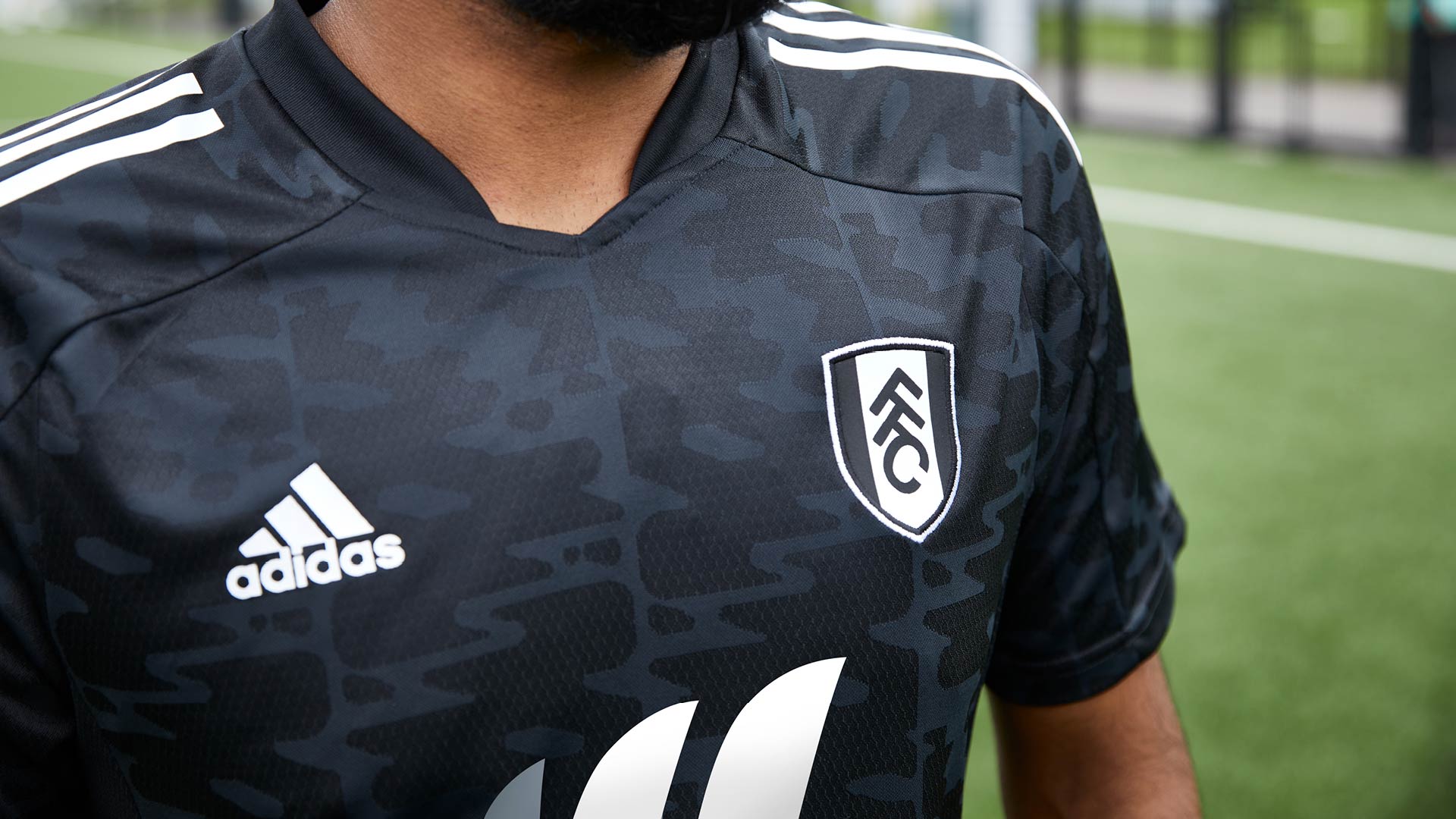 Fulham’s away strip for 21/22 returns to black, featuring a camo-style detailed pattern, and is completed by white shorts and black socks.