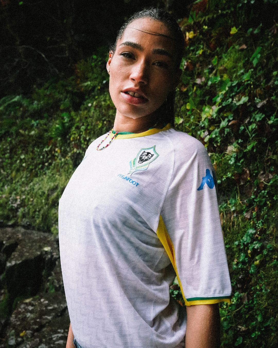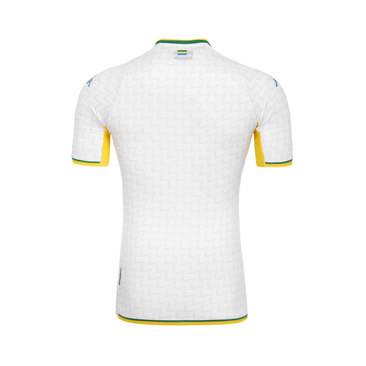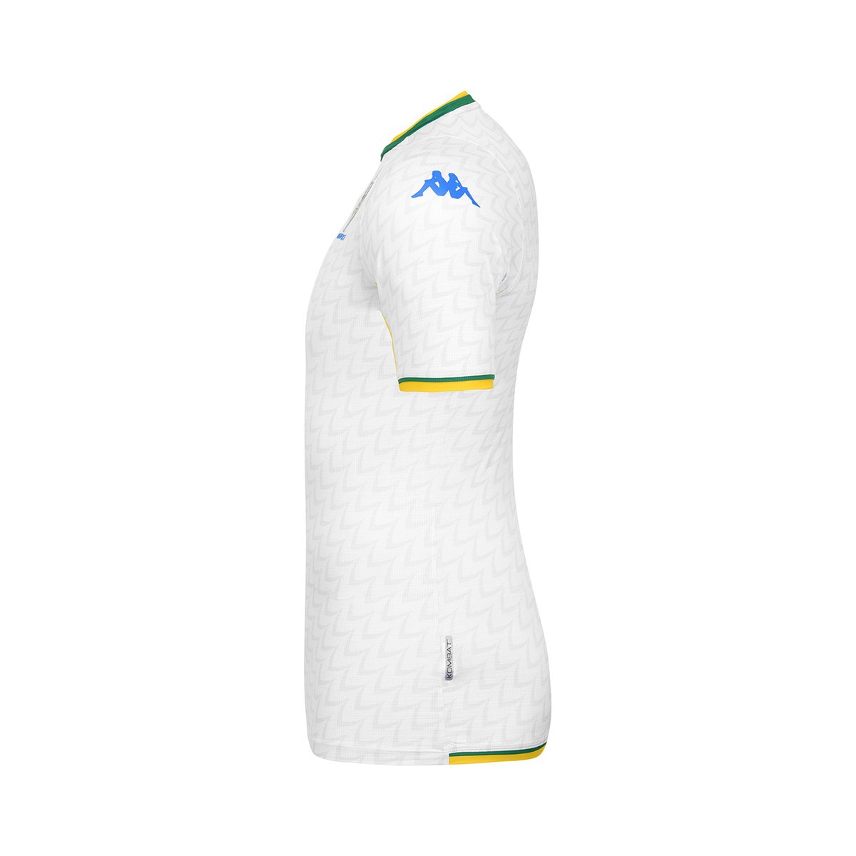 The white shirt boasts a texture pattern on which the full-coloured crest and a blue Kappa “Omini” logos are overlaid.