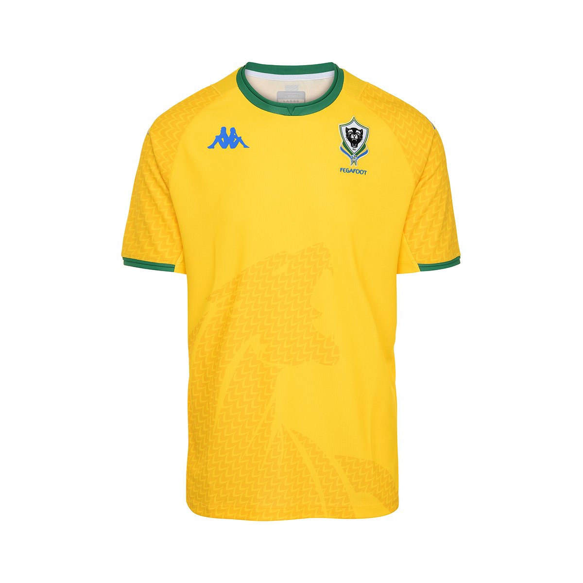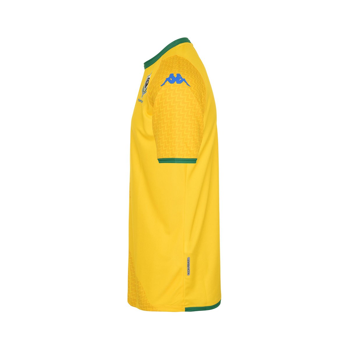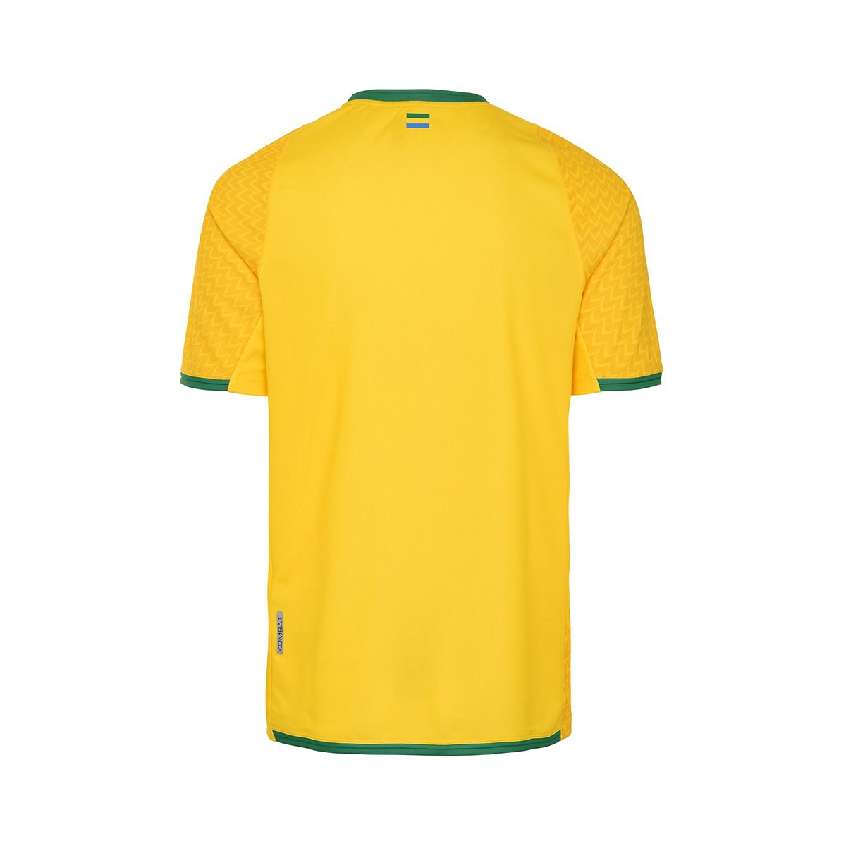 The African international side’s new primary design is relatively understated at first glance, in yellow with a full-coloured crest, blue “Omini” chest logo and green trim.