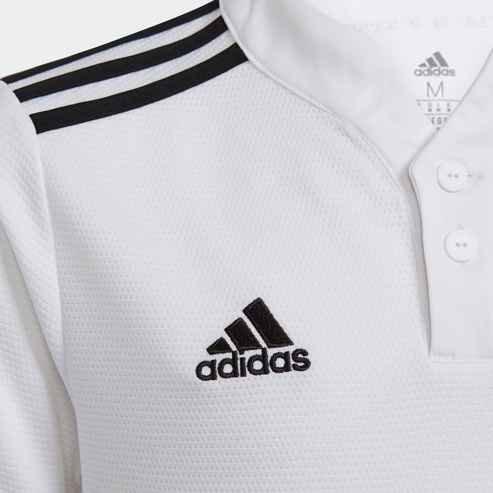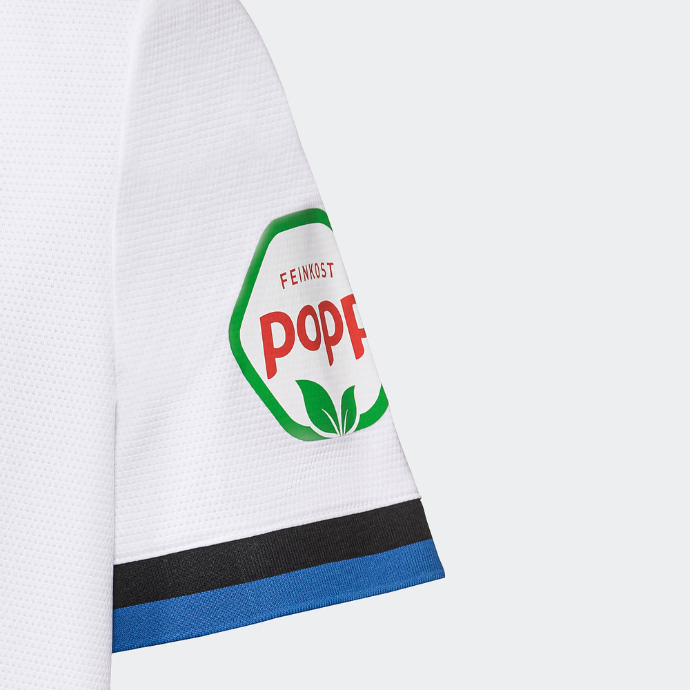 The new adidas jersey is made out of a textured, white fabric and features a button-up collar. The blue and black cuffs complement the classical look of the shirt, which features all three of the club’s colours.