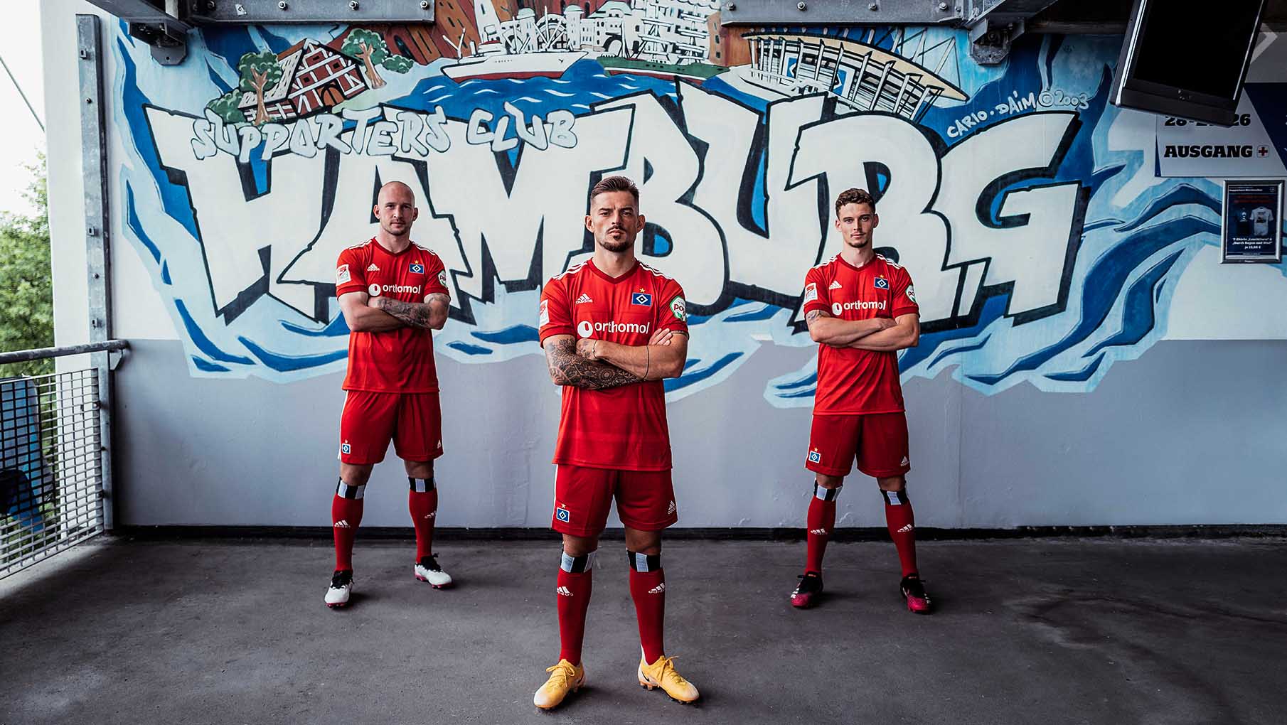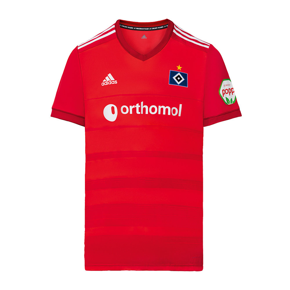 This look - which nods to the city of Hamburg’s coat of arms colours but inadvertently brings domestic rivals Bayern Munich to mind - is overlaid with adidas branding and the main sponsor’s logo in white, and the crest in full colour.