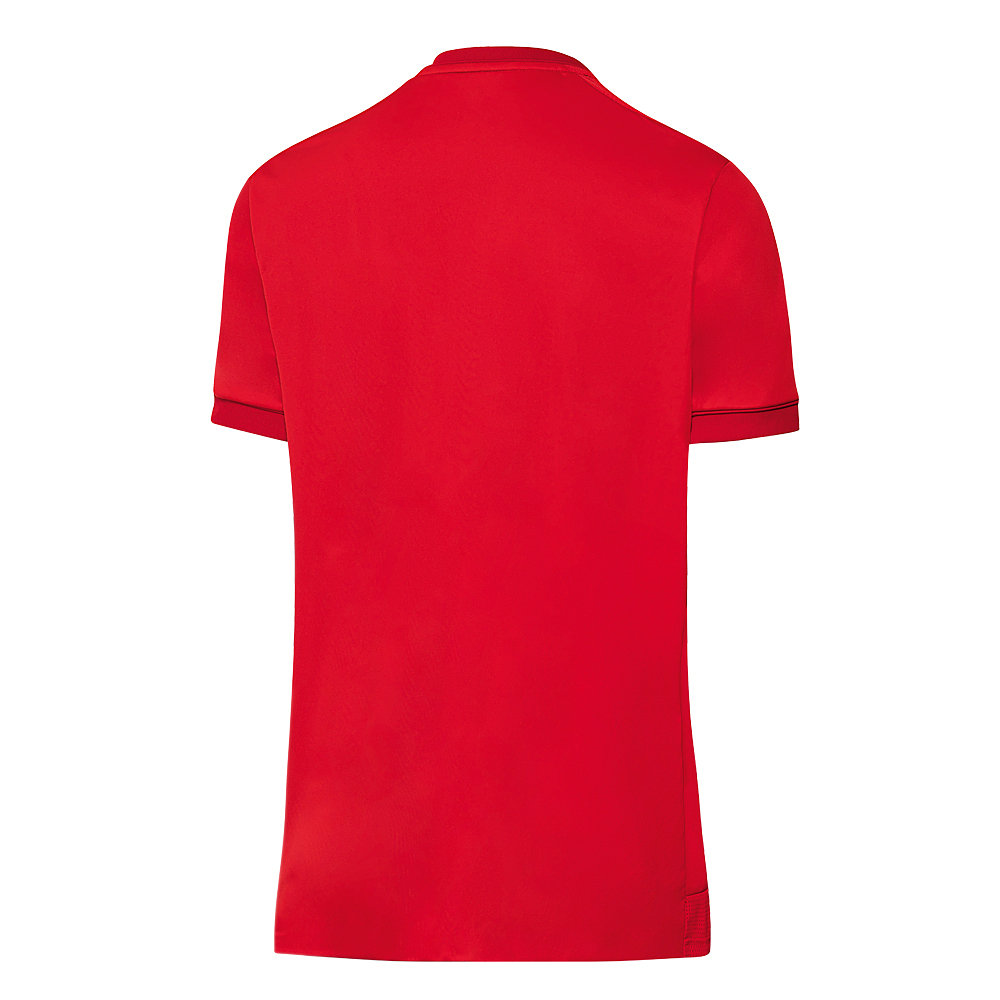 The 2021-22 secondary change design is in red with a tonally styled horizontal striping effect to the front of the trunk and tonal neck and cuffs.