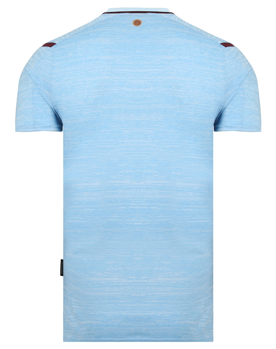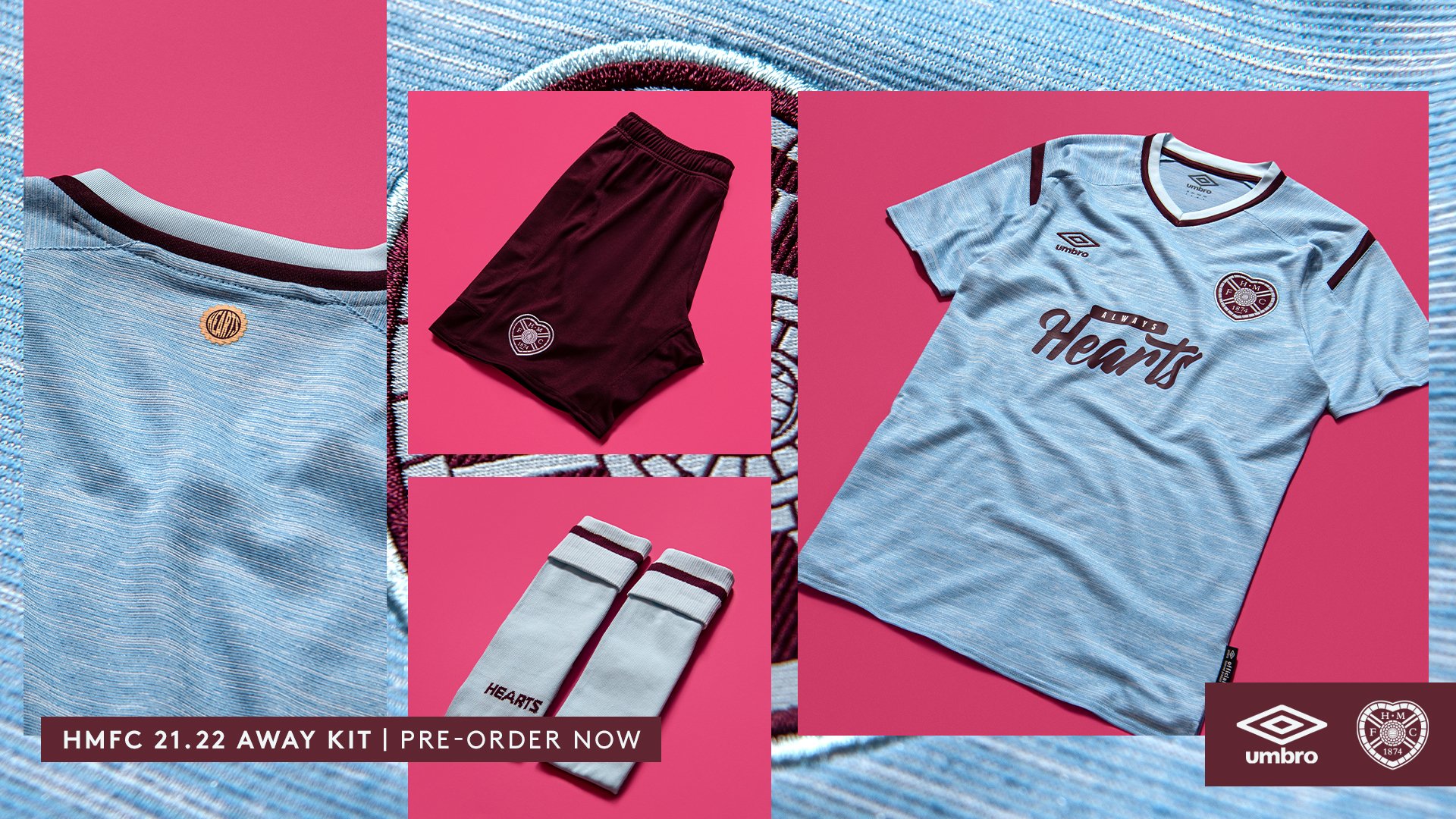 The brand new top features a lifestyle space dye light blue marl colour complete with maroon shoulder panels, the embroidered Umbro diamond and a two-colour Heart of Midlothian crest.