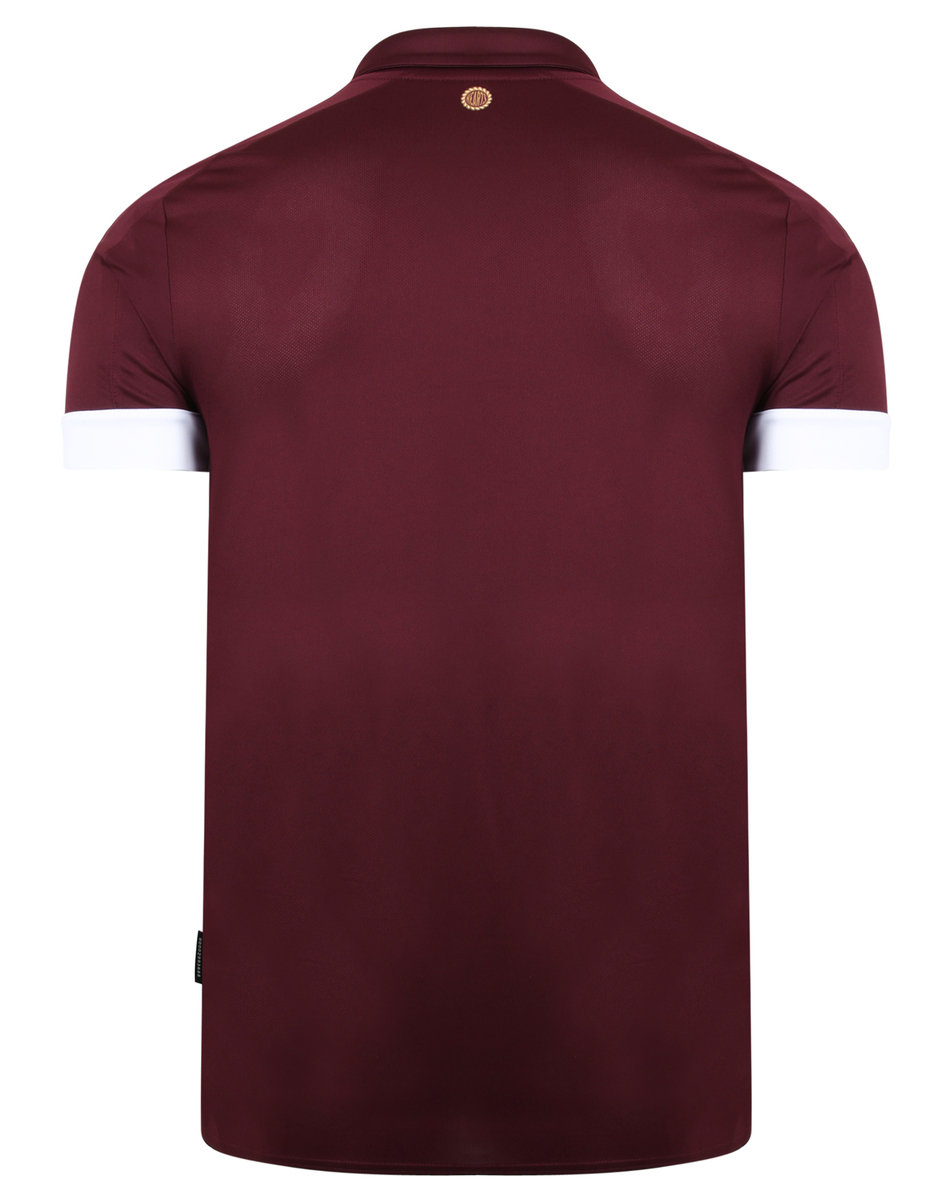 In keeping with club traditions, the home kit is a classic dark maroon jersey with a maroon fold over collar and narrow white paneling running down the shoulder to the white cuff.