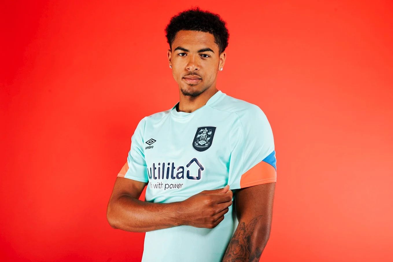The sleeves feature hints of Huddersfield Town Blue, Navy to match the Away Kit, and a Fiery Coral matching the player’s training range for this season. The base of the reverse of the shirt will again feature the SportsBroker logo.