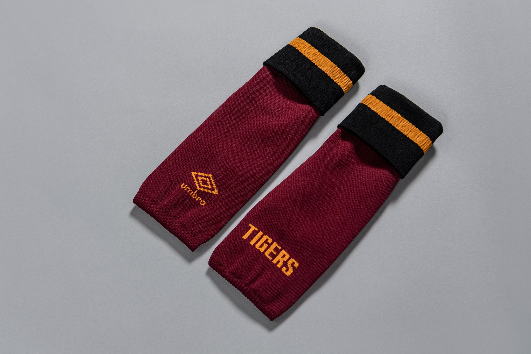 Completing the kit are claret socks with black turn over and an amber hoop, with an amber jacquard stacked diamond and ‘Tigers’ lettering, cotton footbed, elastic cuff and instep cool zone technology.