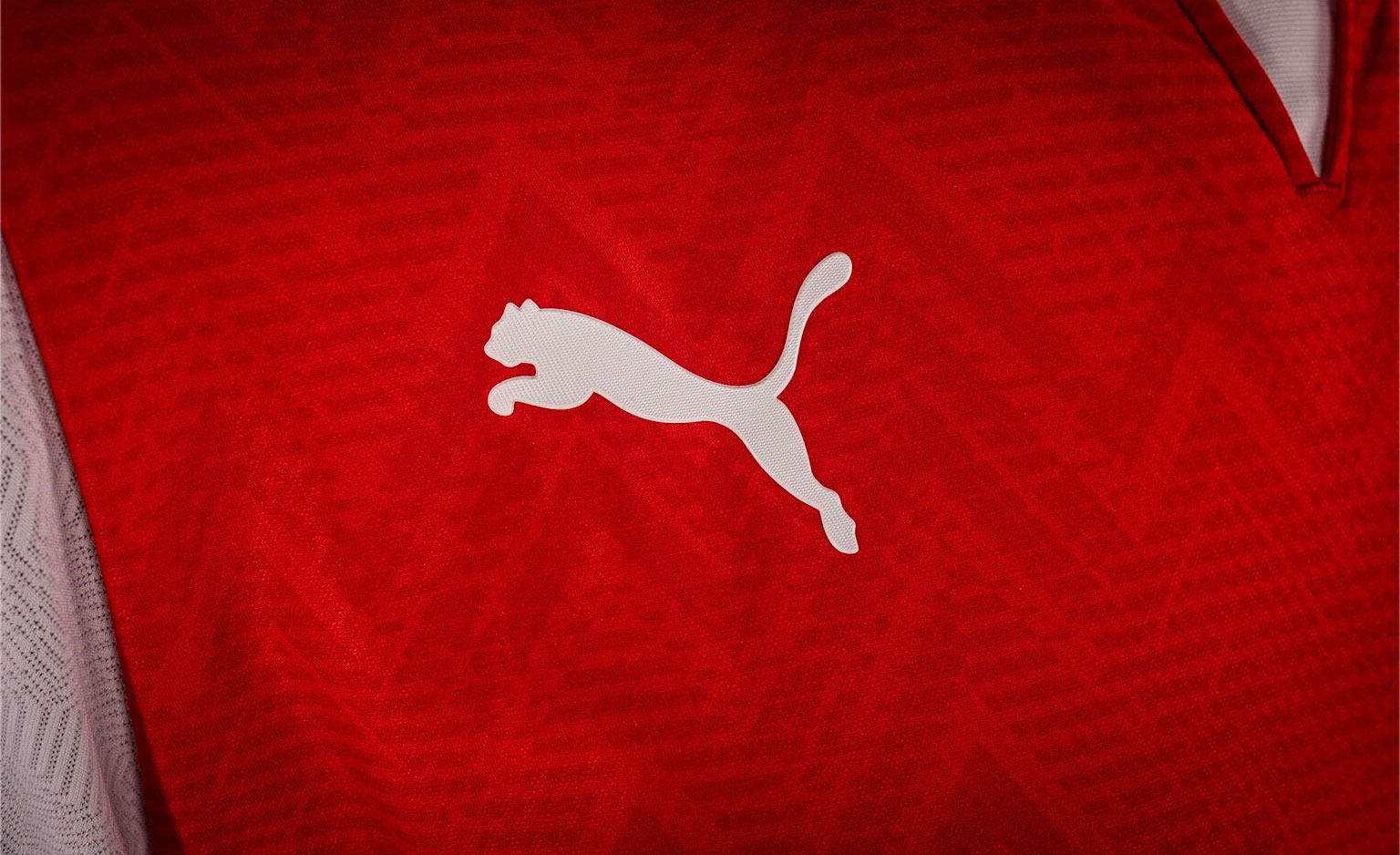 The crest is rendered in a basic, contrast-white-outline form, and is encircled by 18 stars - each representing an international title - while the Puma cat logos and other partner wordmarks also stand out.