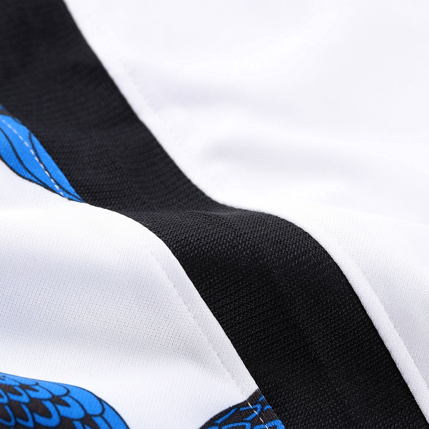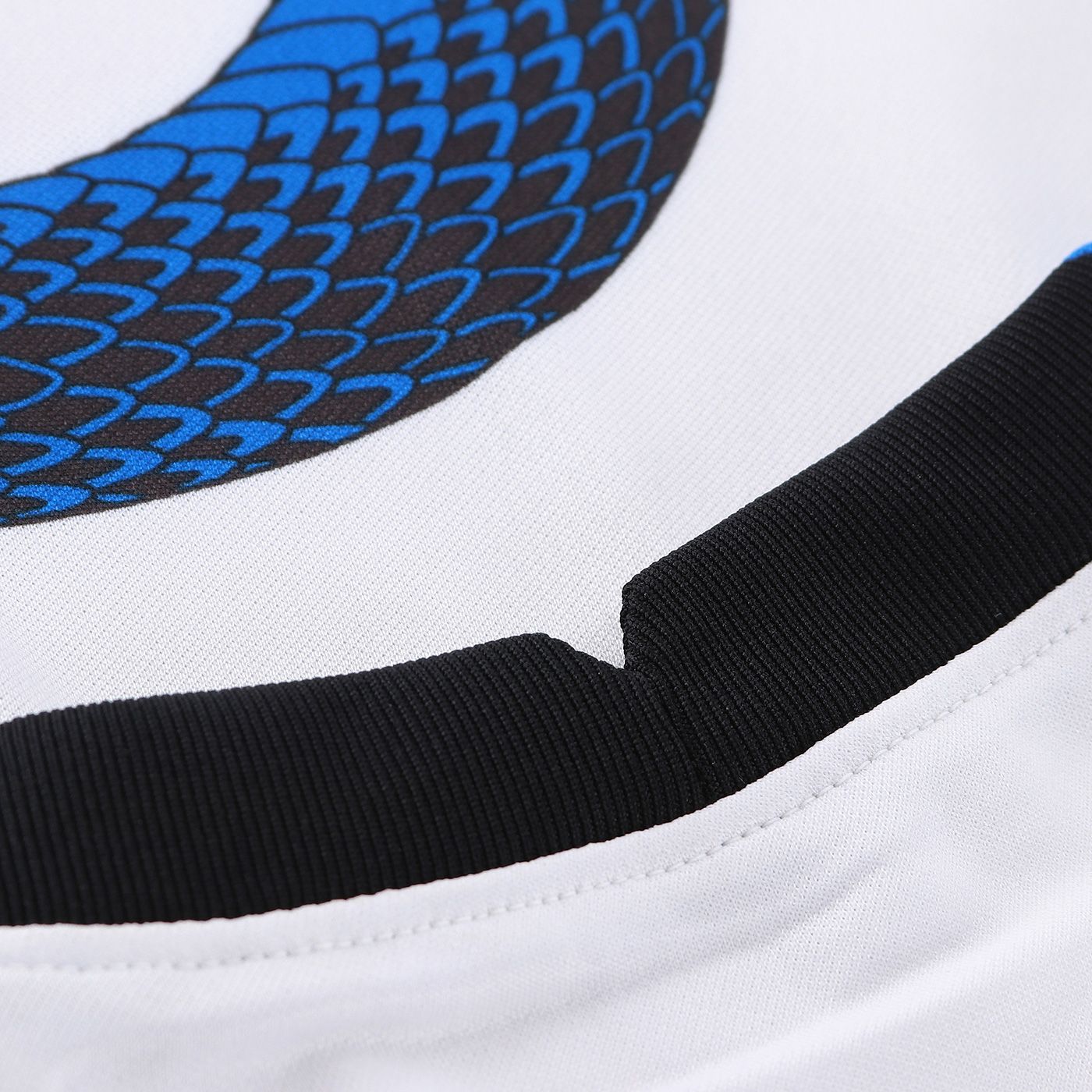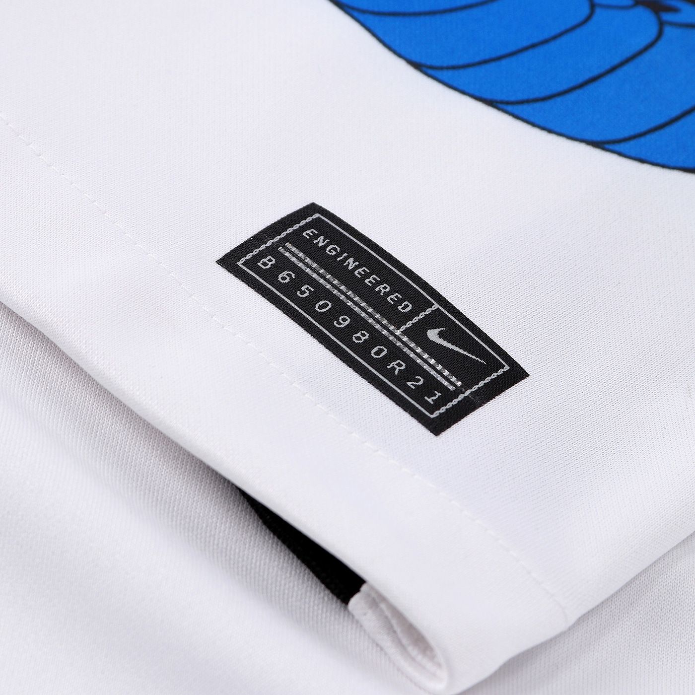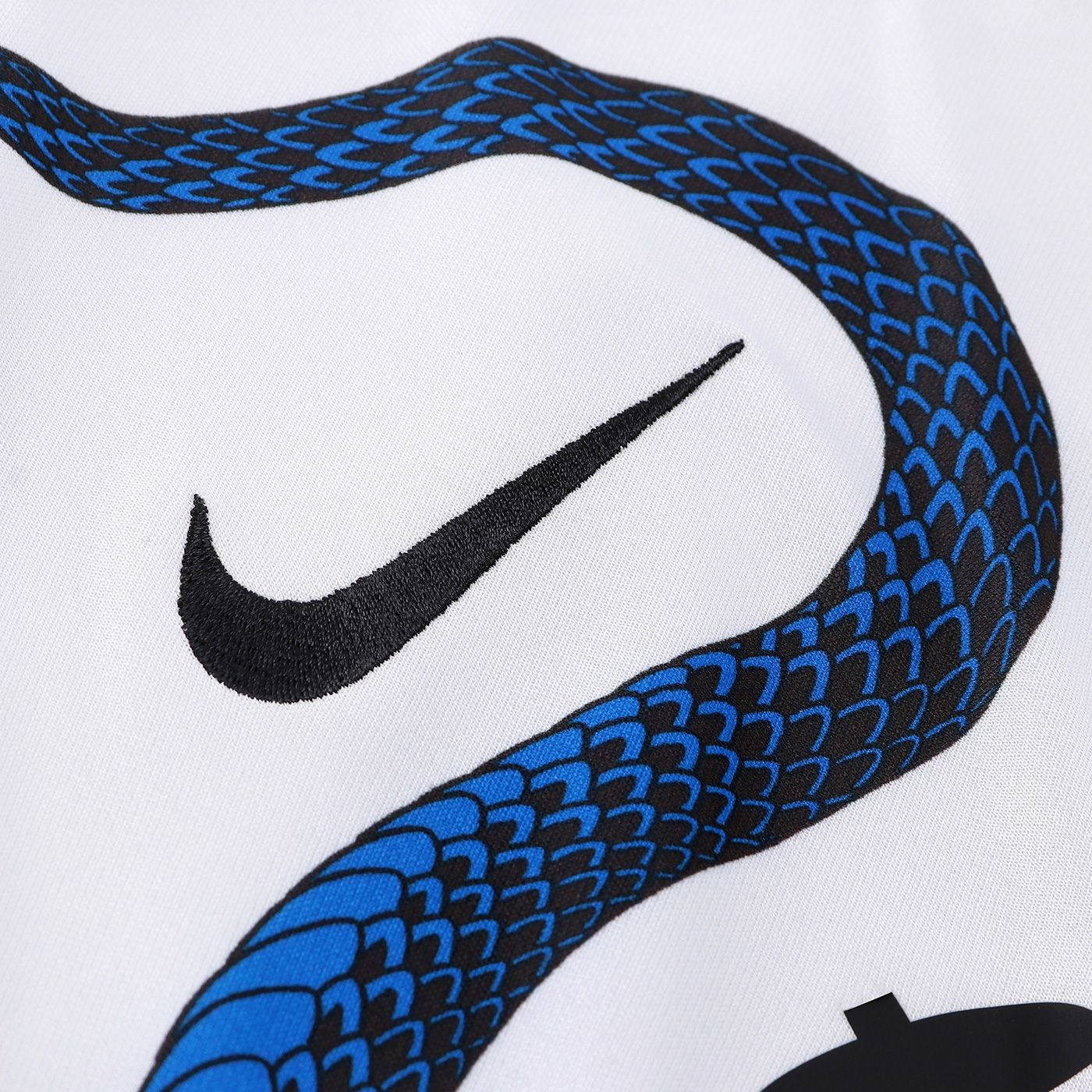 The new Away shirt's design is white with a hand-drawn black-and-blue serpent running from front to back. White shorts and socks complete the kit. The Nike swoosh is blue with a black/blue trim on the sleeve and on the sock.