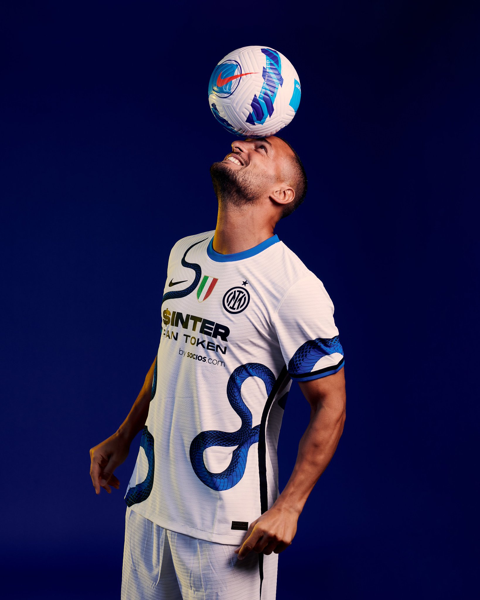 Keeping with the Home version’s main theme, the Away kit features Inter’s iconic Biscione changing its skin and celebrates the club’s new visual identity.