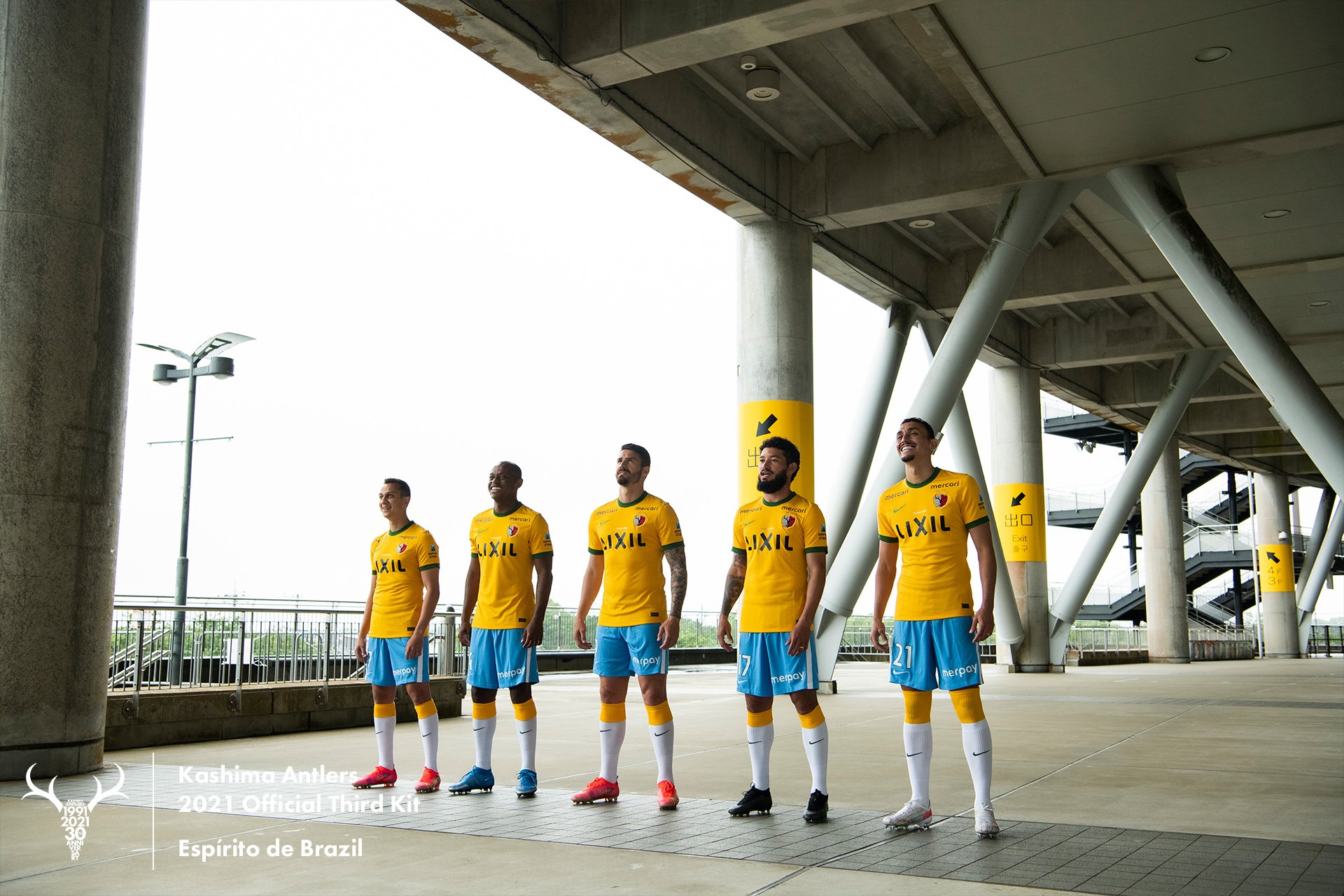 The new secondary change outfit for the Japanese J1 League side is styled like a classic Brazil look: yellow shirt with green trim, blue shorts with white trim, and white socks.