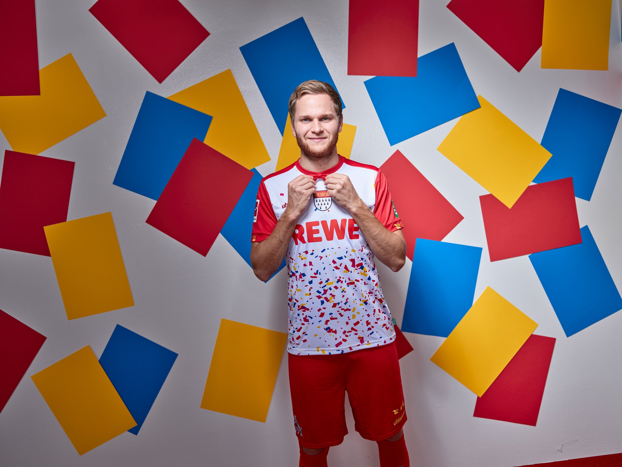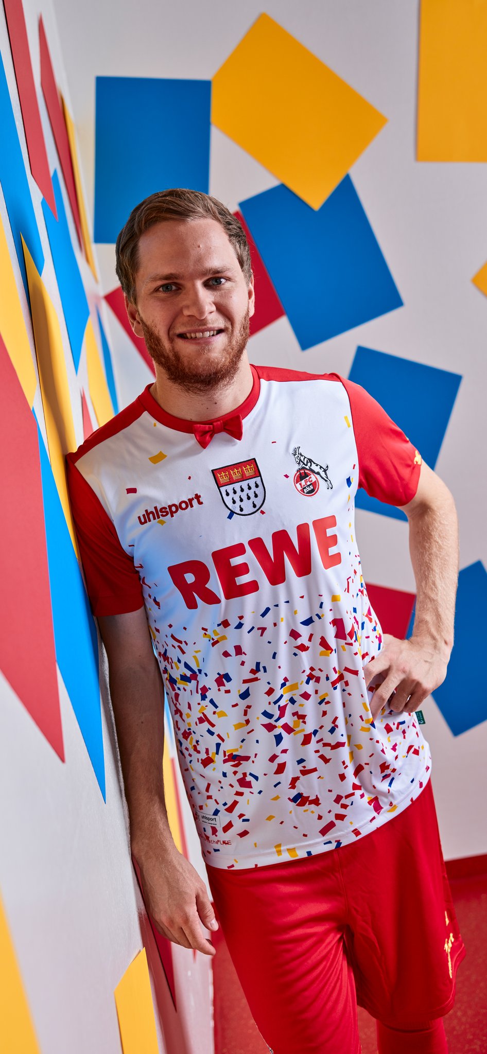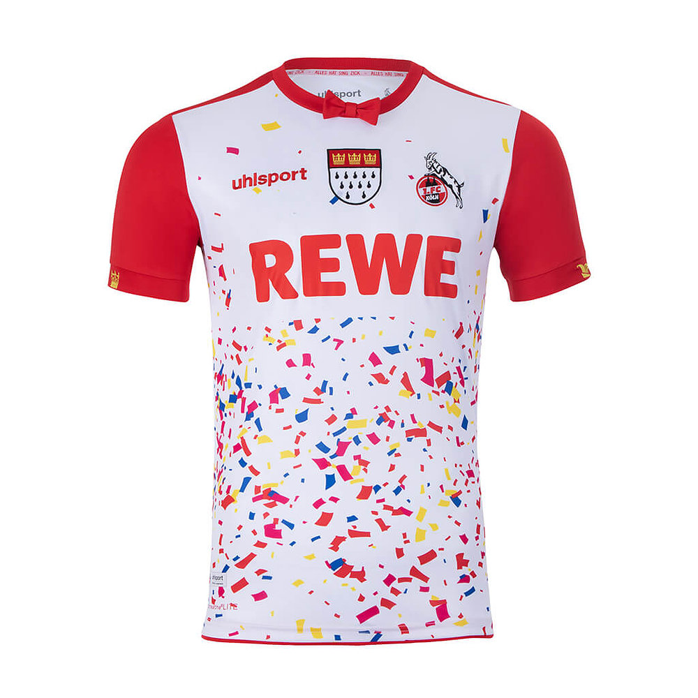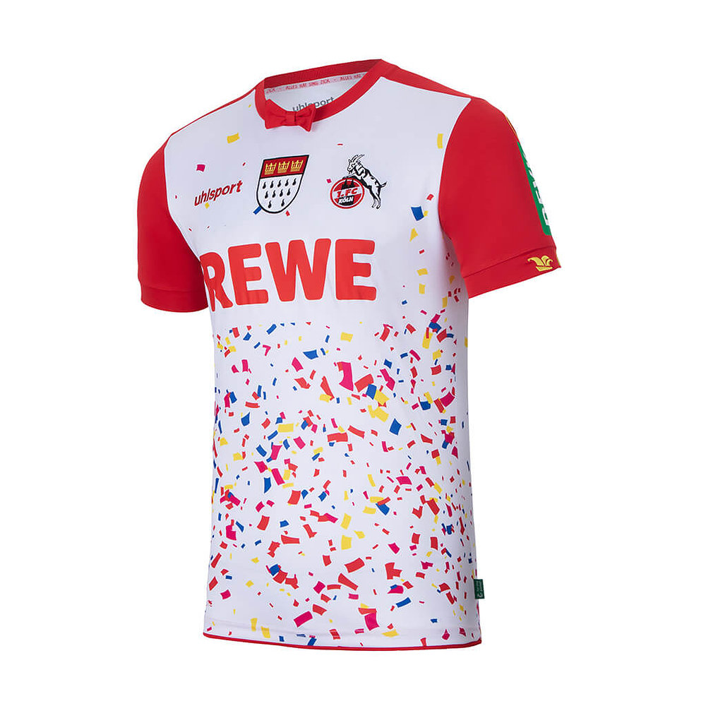 Arguably unnecessarily, the logo of main sponsor “REWE” has been granted a clear space where confetti doesn’t appear, and the red shorts and socks that complete the kit are barely distinguishable from the standard Away versions.