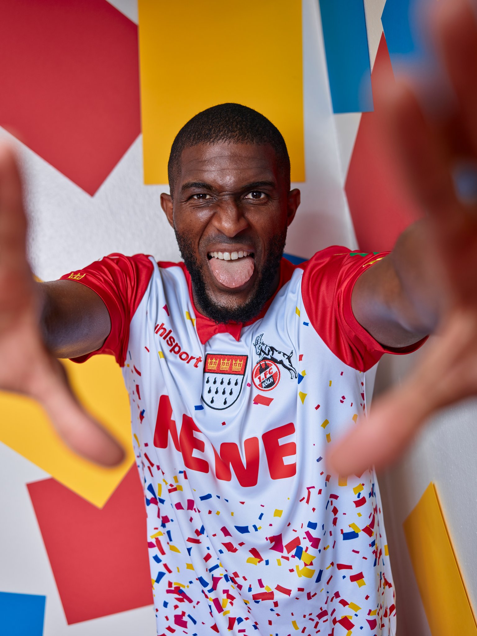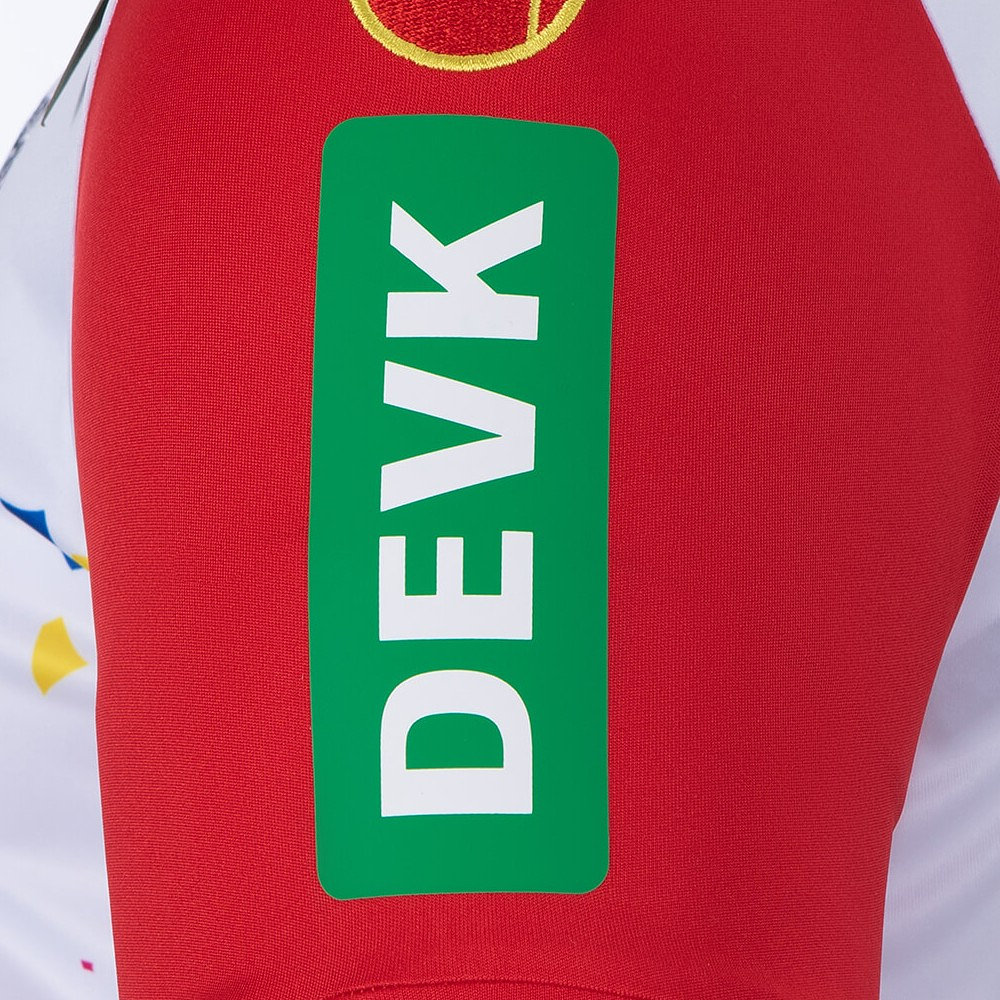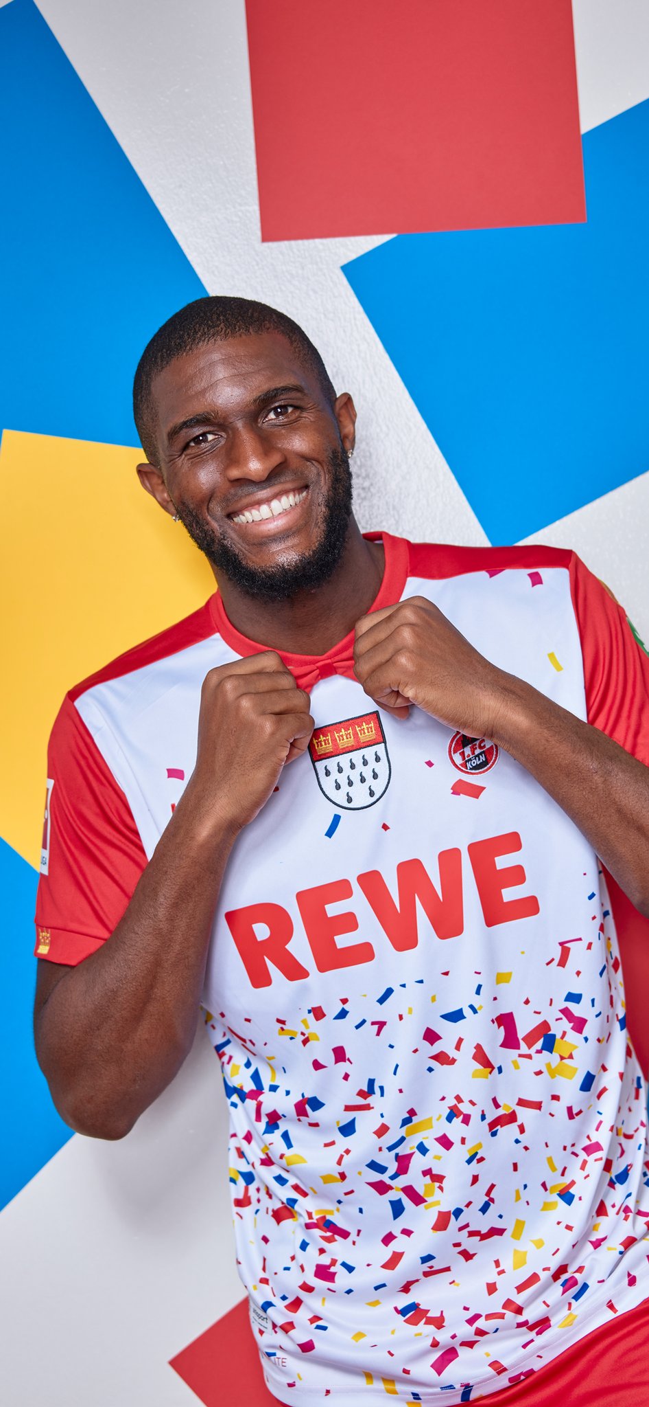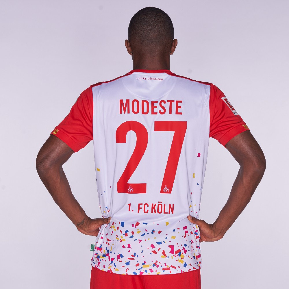 Arguably unnecessarily, the logo of main sponsor “REWE” has been granted a clear space where confetti doesn’t appear, and the red shorts and socks that complete the kit are barely distinguishable from the standard Away versions.