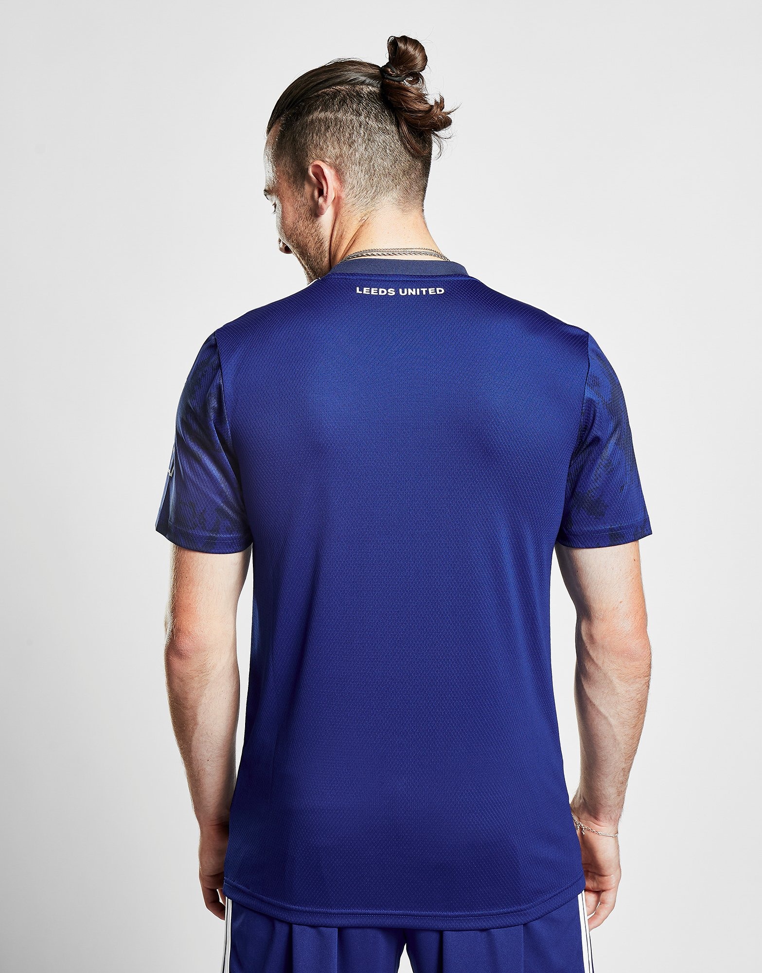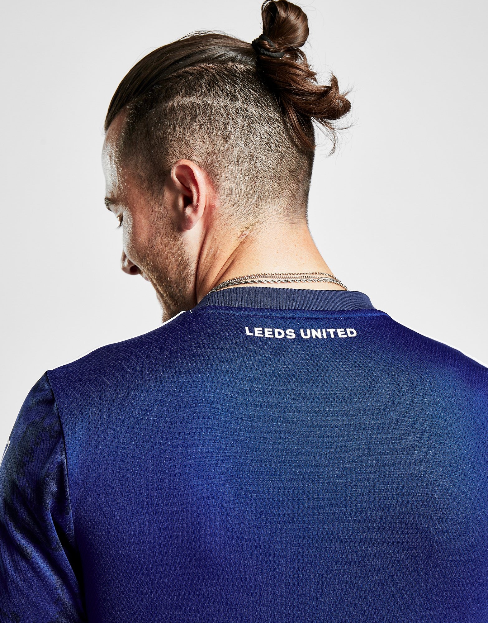 This away jersey features a tonal camo-style design, subtle white details, a ribbed crewneck, and "Leeds United" signoff.