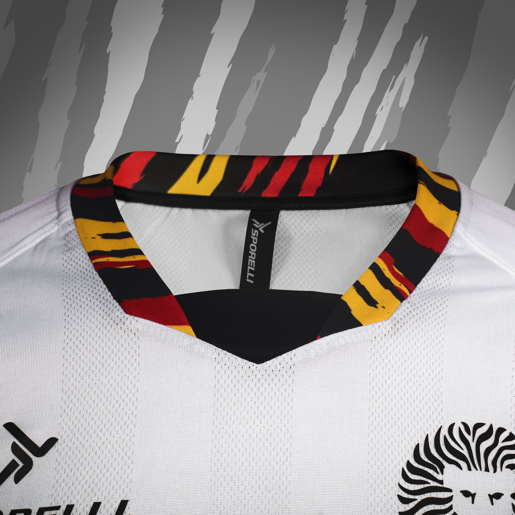 Produced by Mexican brand Sporelli, the new secondary design is in white with animal-print-styled neck and cuffs in the famous red, yellow and black.
