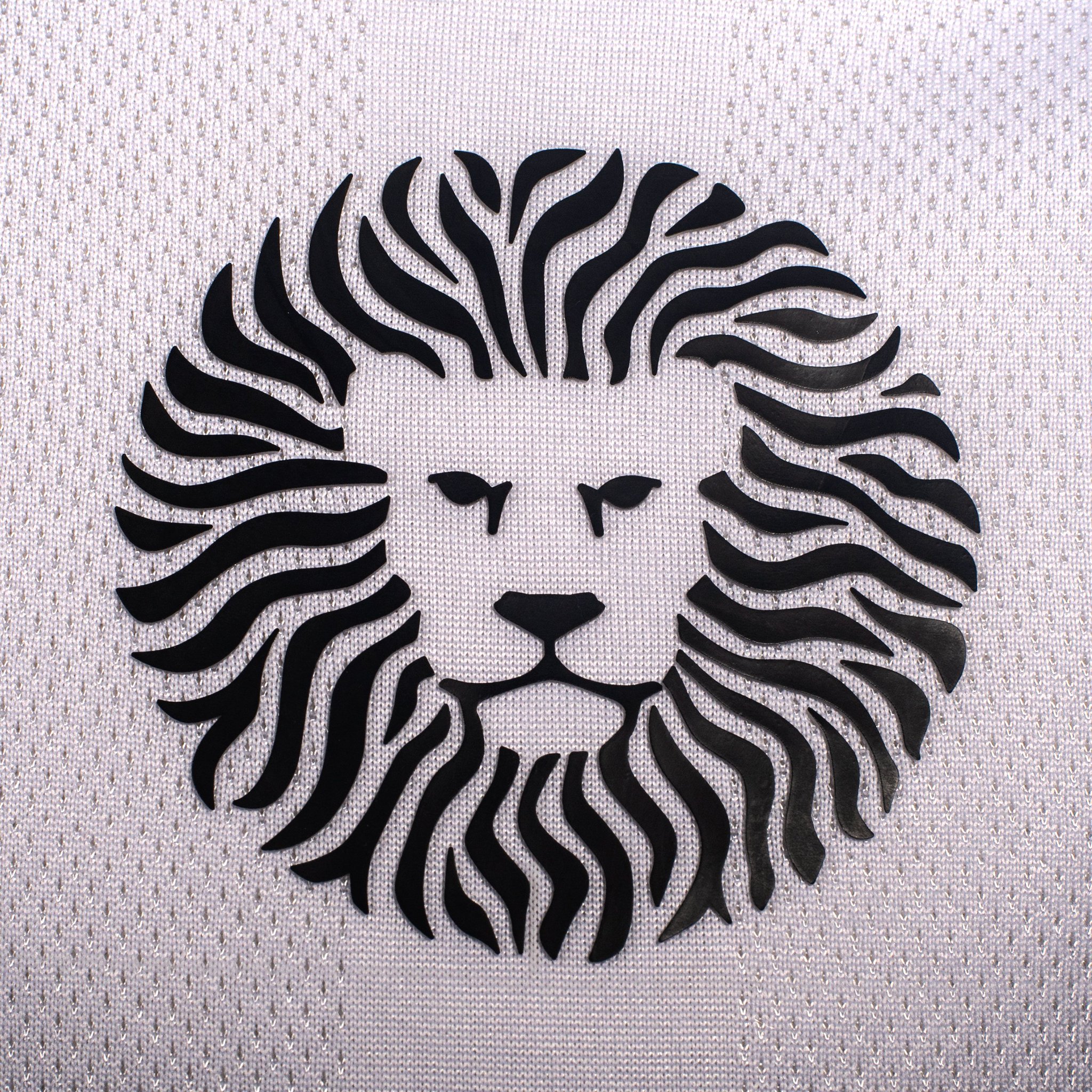 Further embellishment, including the recognisable lion’s head crest, is in black on white, while the base also boasts a striping effect rendered through a shadow jacquard.