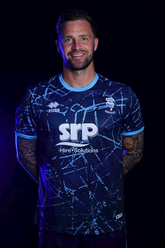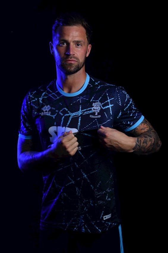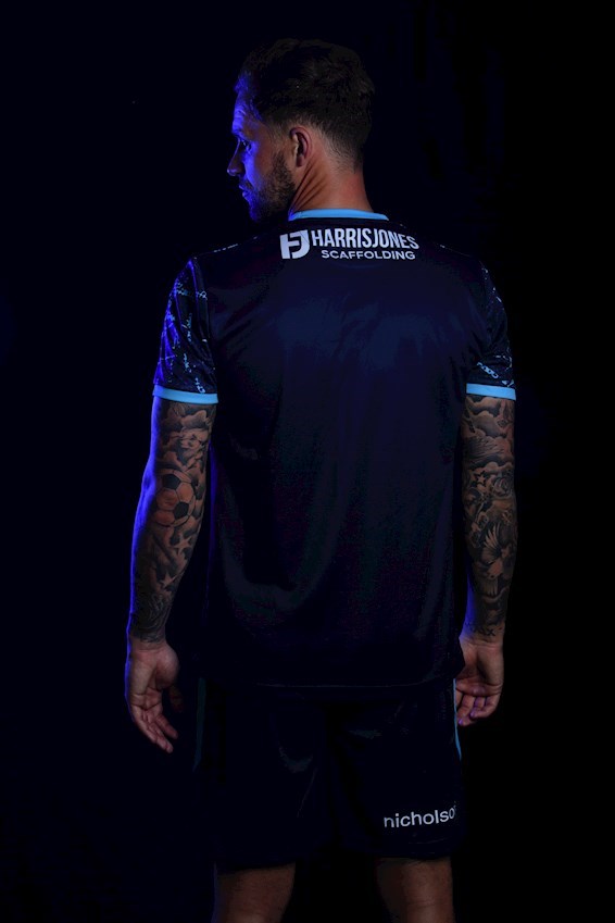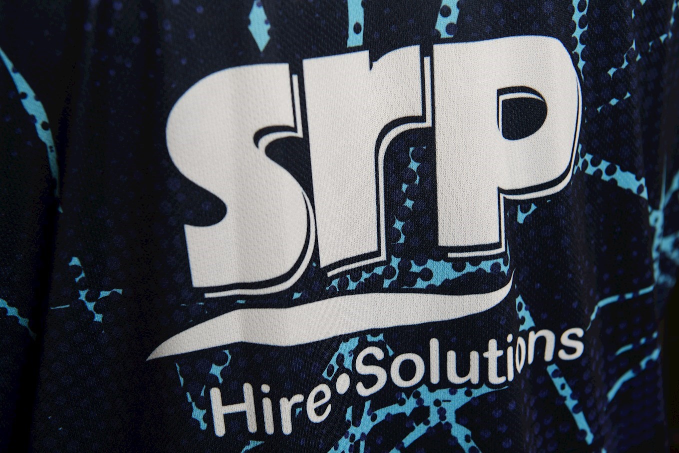 The bespoke design features a distinctive light blue pattern, with an adorned white club crest and Errea logo. The shirt is sponsored by club partners SRP Hire Solutions.