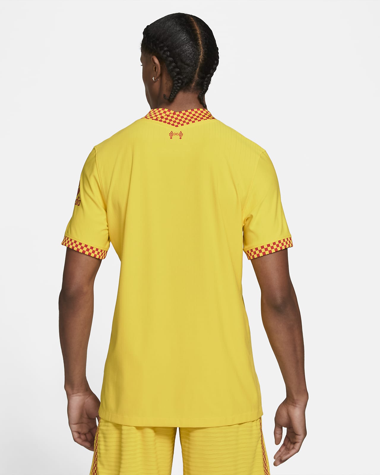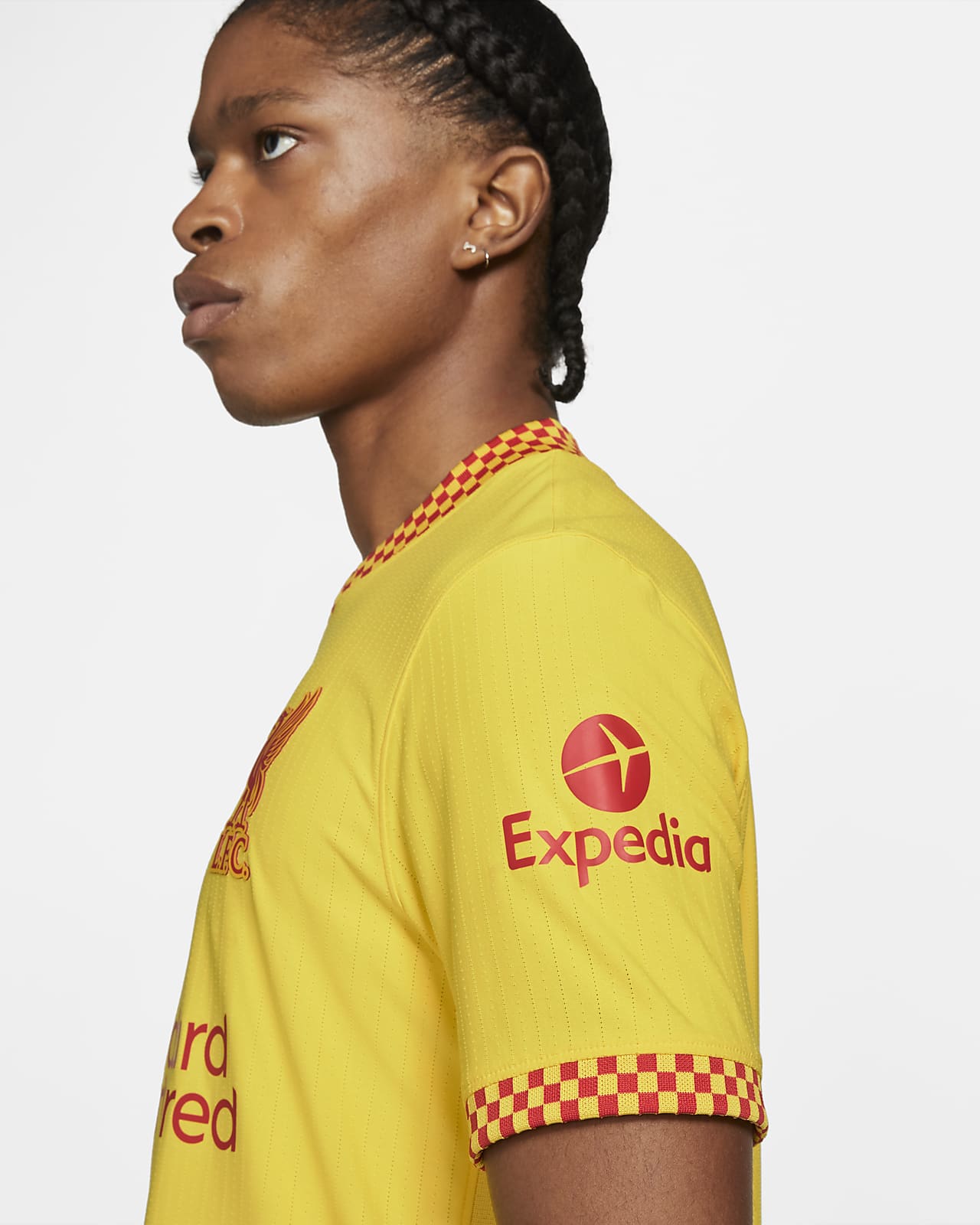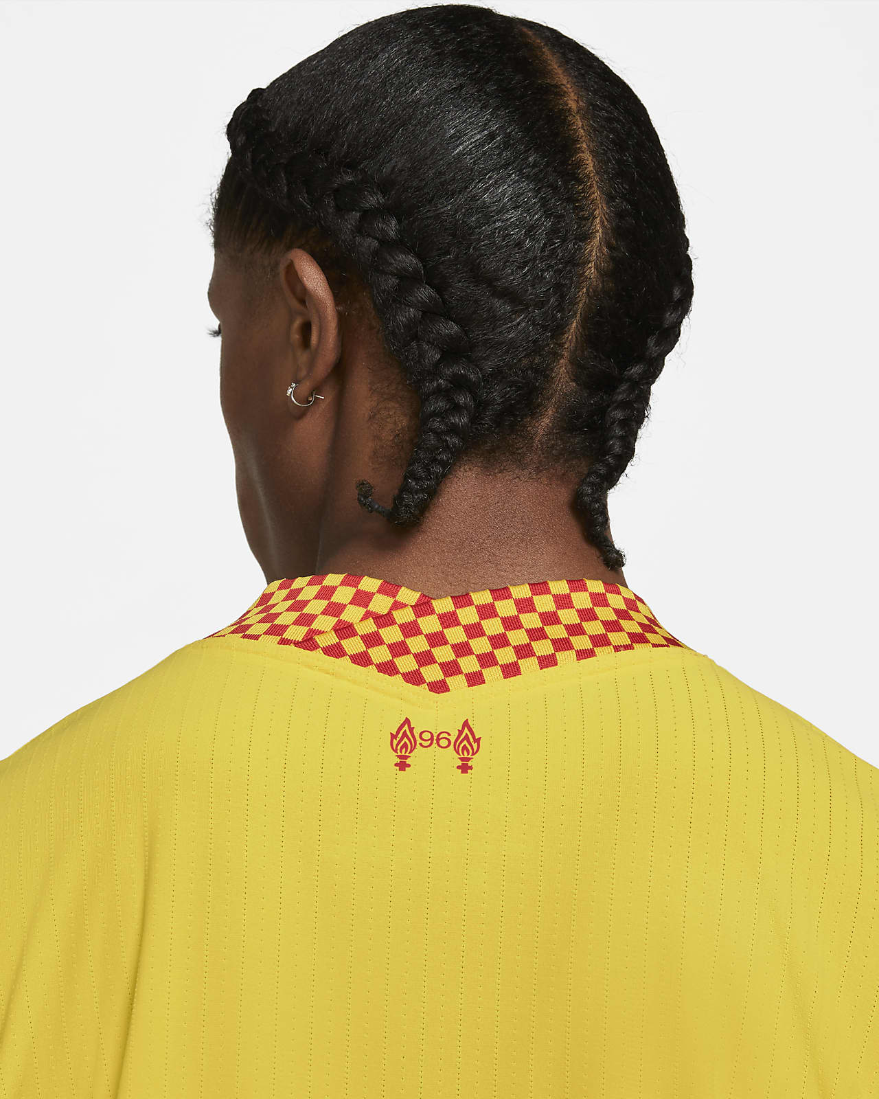 The bold yellow jersey is representative of the club’s rich history in the colour. The red-and-yellow chequered trim on the collar draws on the passion of The Kop and the flags that fill the stands, while pinstripes highlight the tight bond between the club and its community.