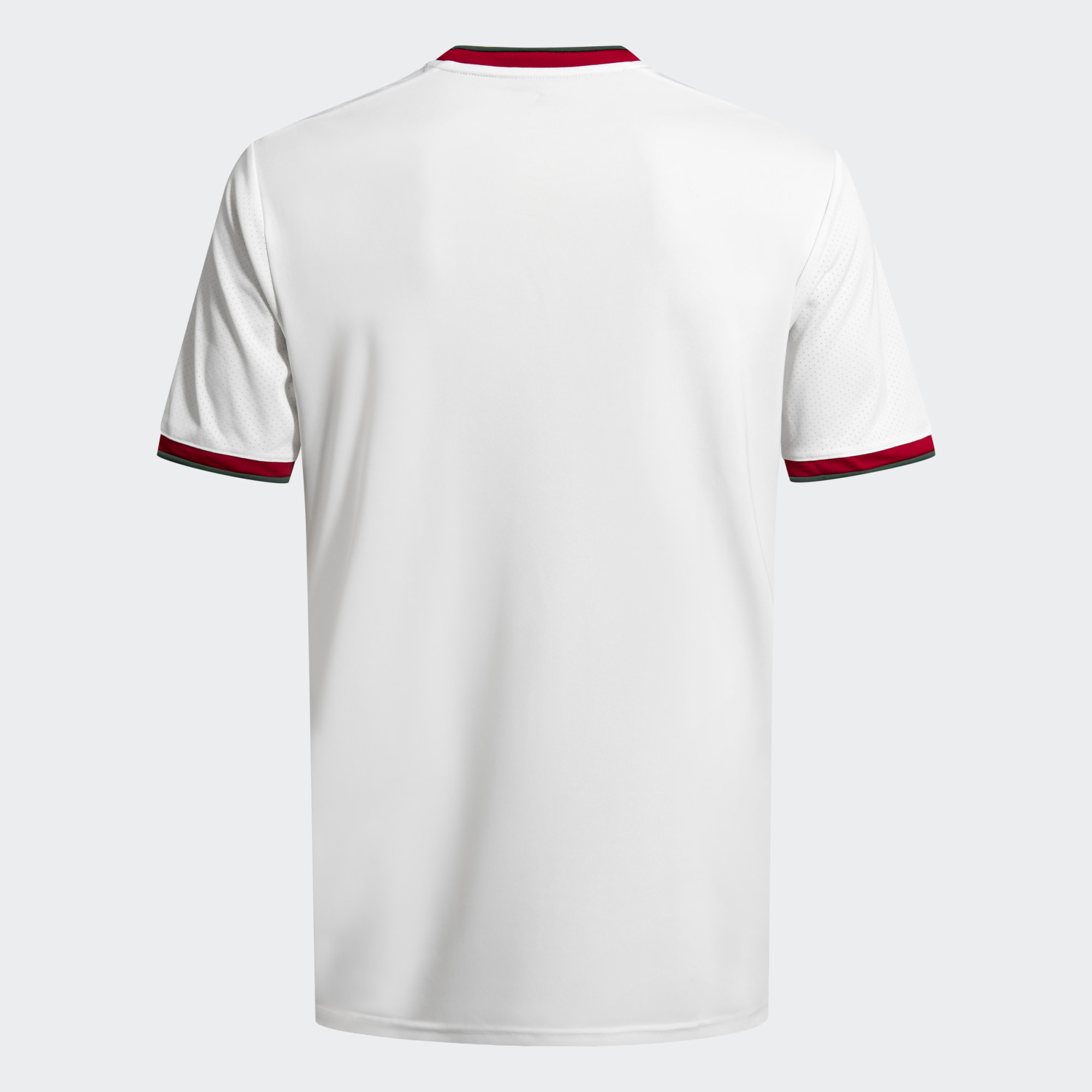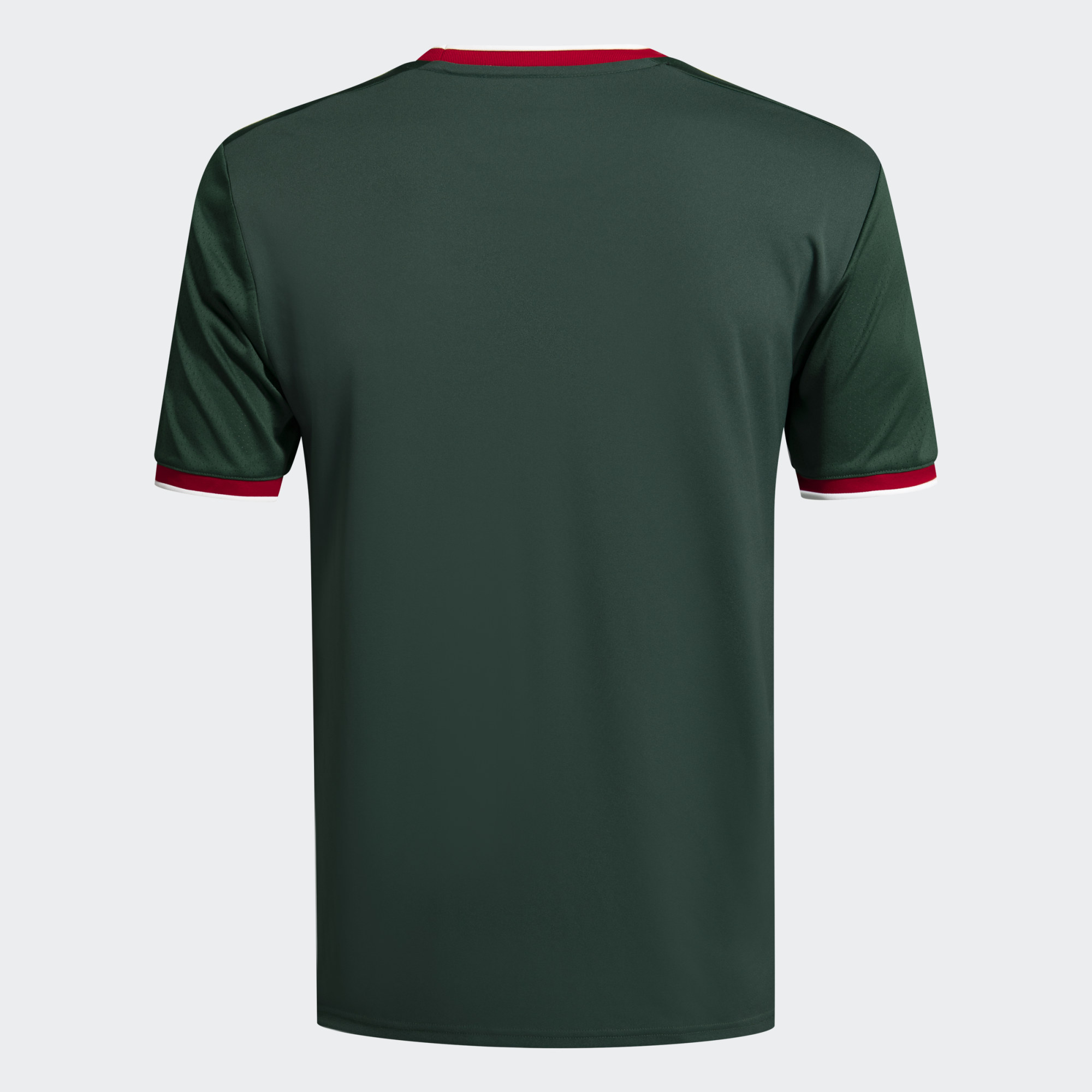 The 2021-22 primary design by adidas is in a deep green with the main sponsor logo and adidas branding in white, matching the detailing on the neck and cuffs, which also feature red.