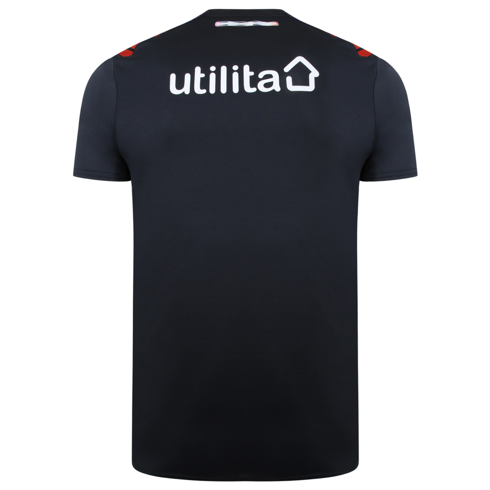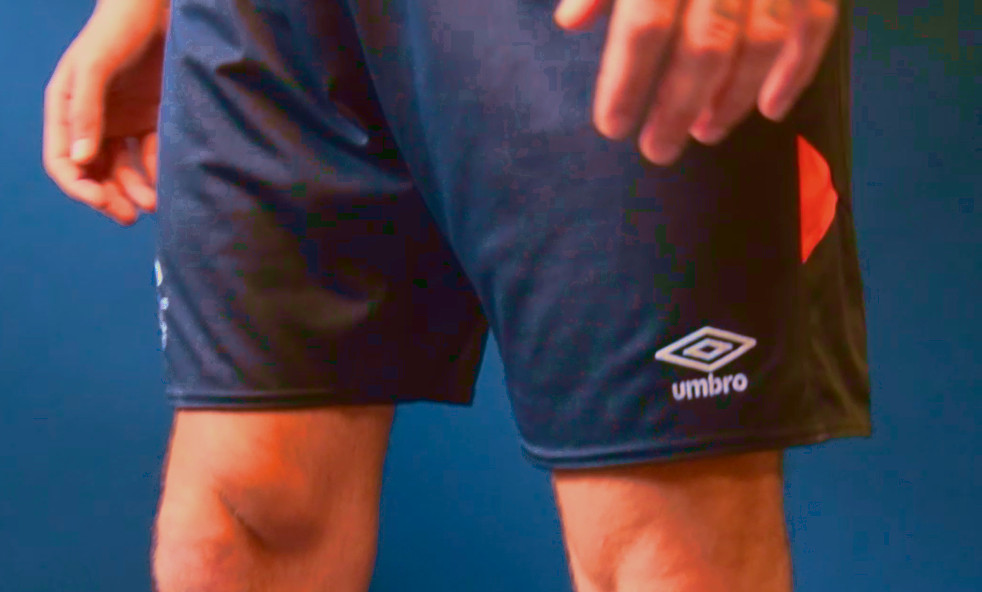 With a colourful background pattern - in orange and royal blue on the navy base - which suggests a recent calling card of manufacturer Umbro as well as a mid-1990s change shirt, the bold new secondary release has partner branding in white to contrast.