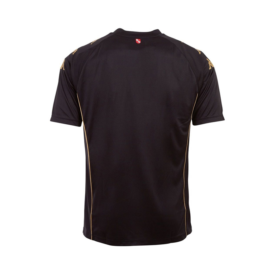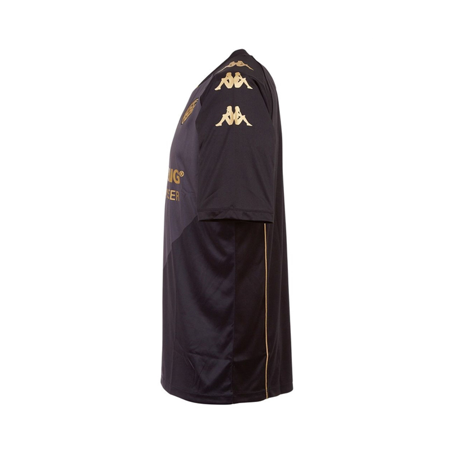 The German Bundesliga side’s 2021-22 secondary change shirt is Kappa branded and has a black and grey look with golden accents.