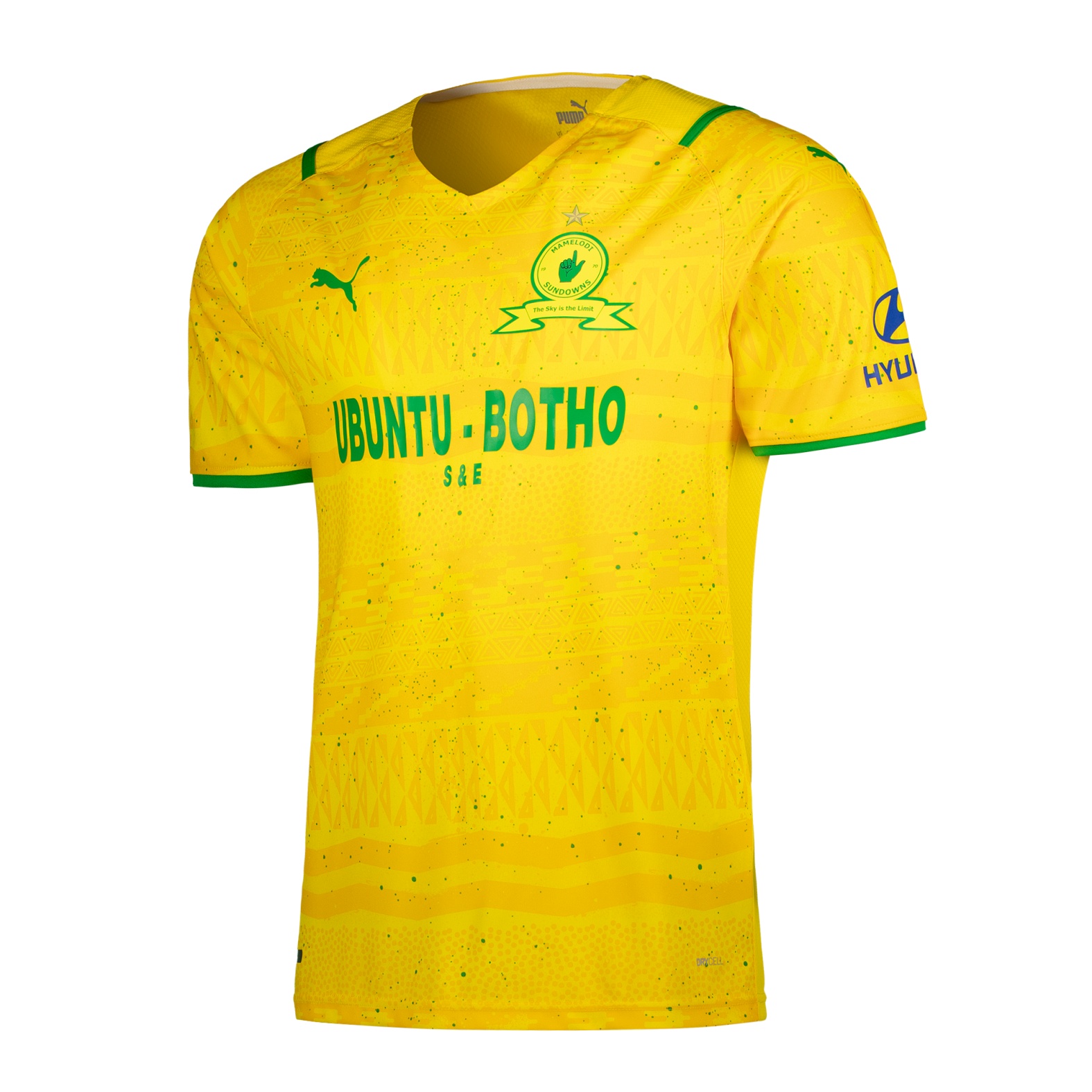 The 2021-22 design for the current South African “DStv Premiership” champions has a yellow base with an African-styled, tonal, sublimated print and detailing in green (the crest fully in yellow and green).