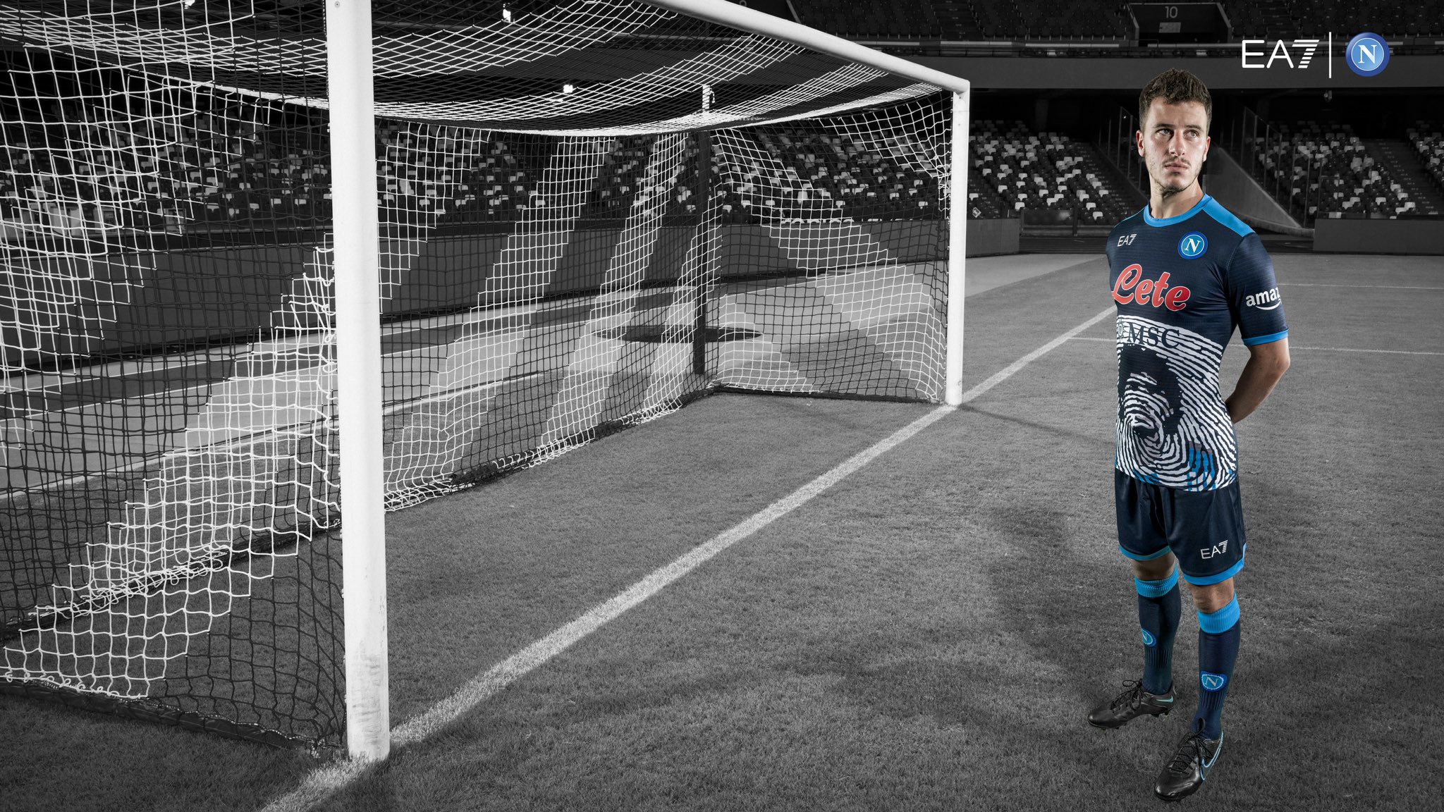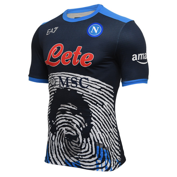 The shirt features an image of Maradona superimposed over a large fingerprint, representing the club's desire to pass on the Argentine hero’s legacy to the younger generations of the city of Napoli.
