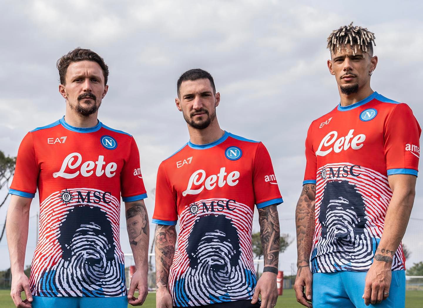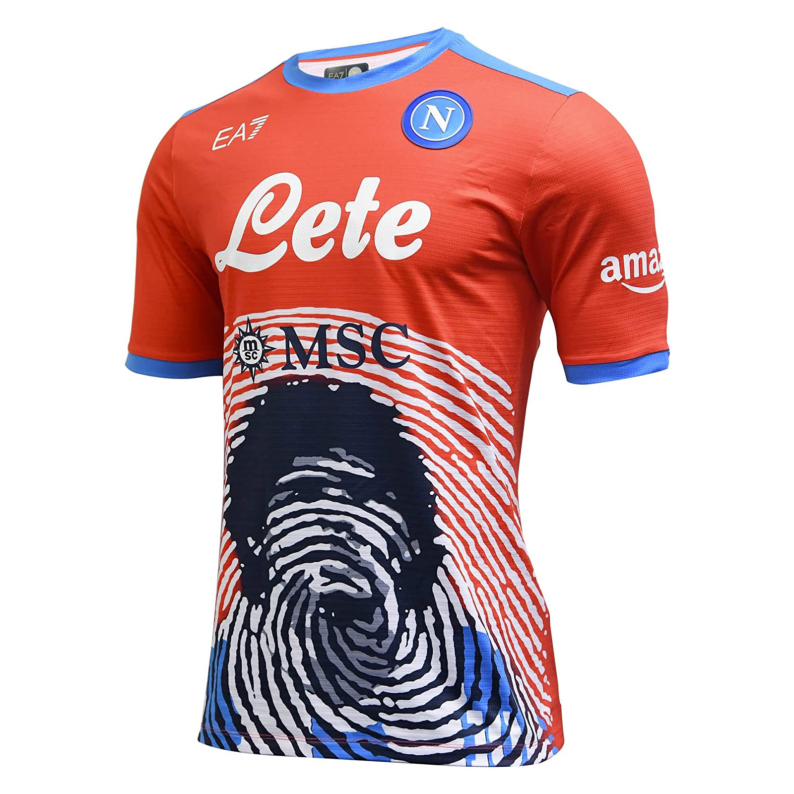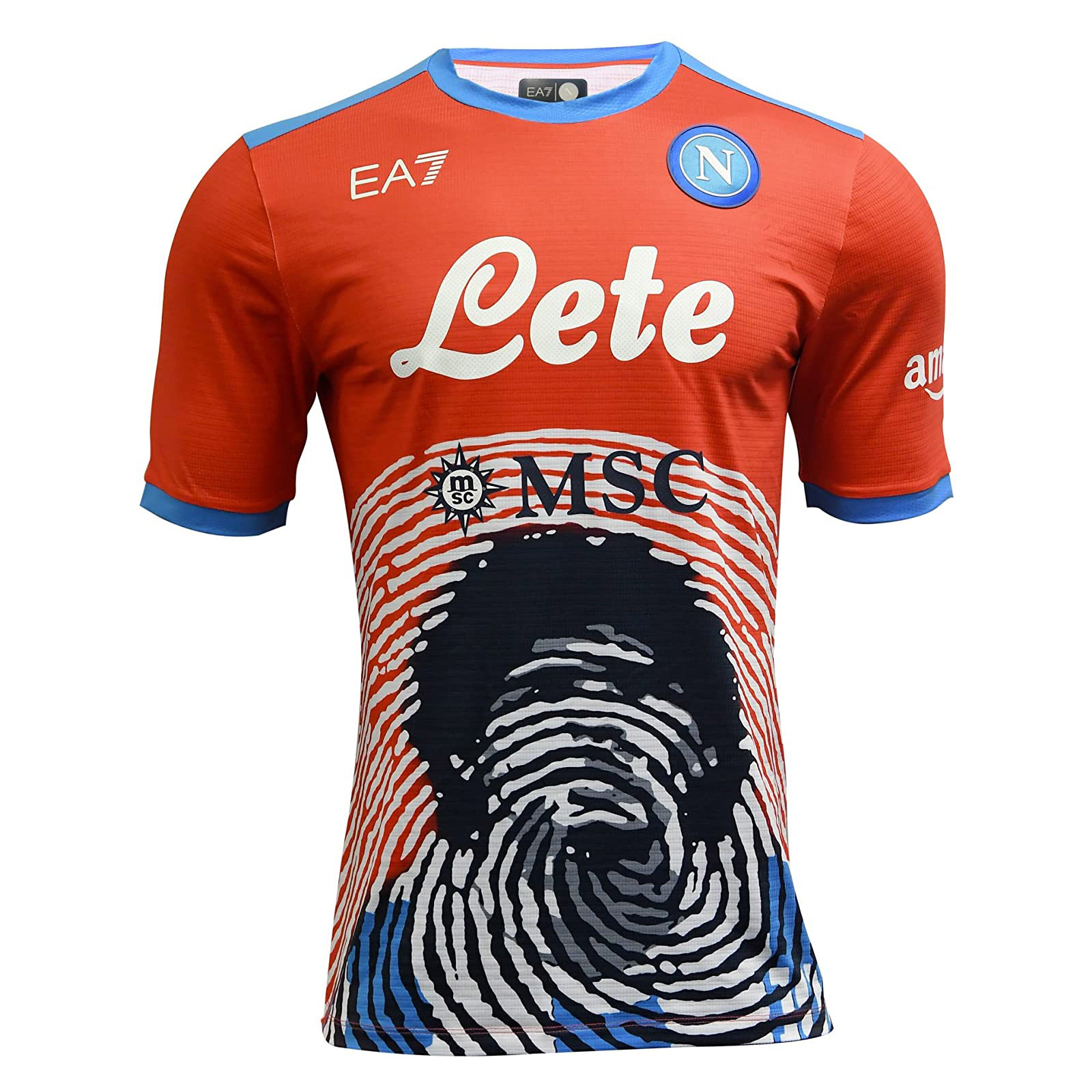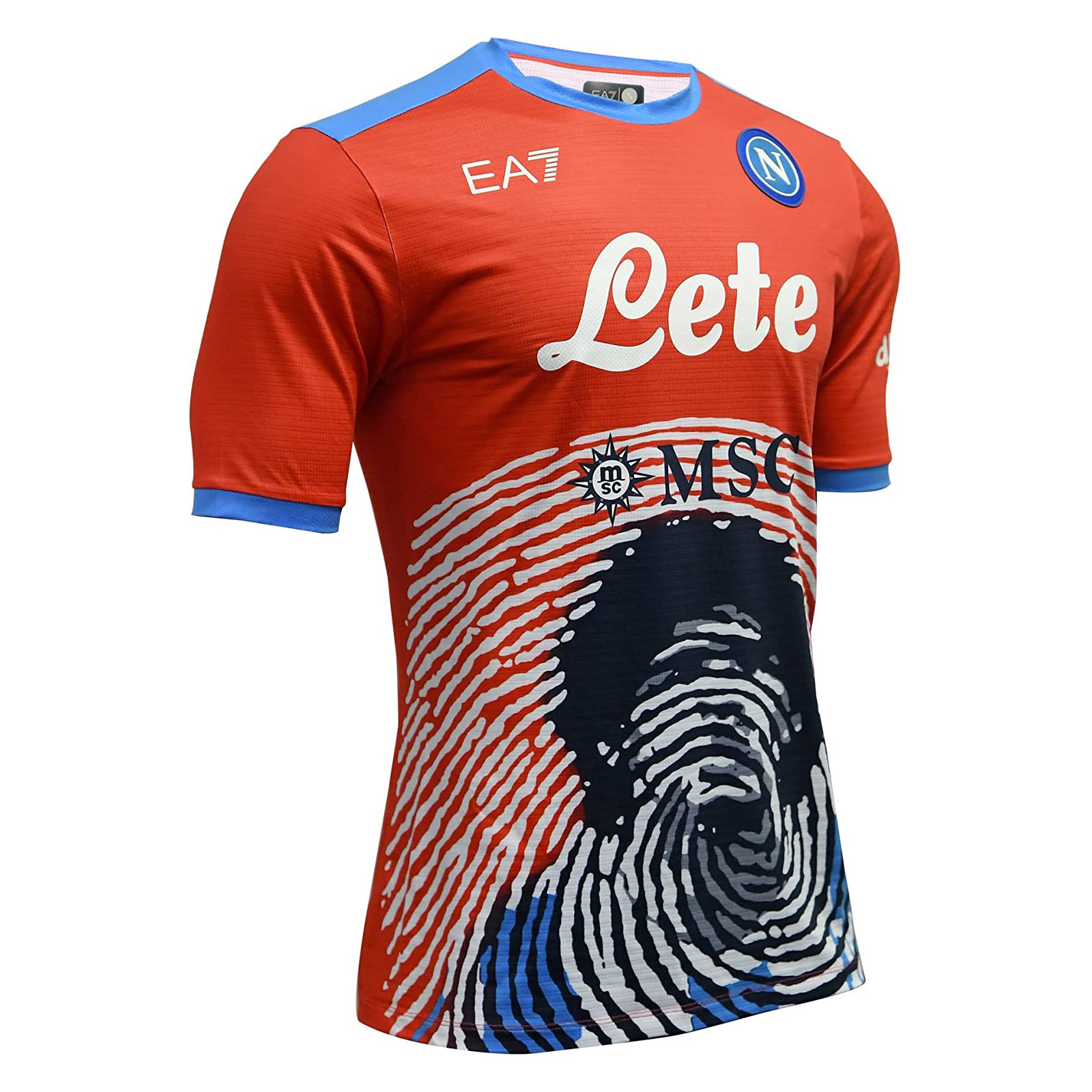 In red with El Diego’s face in black, overlaid with the fingerprint graphic in white, trim is in blue, the crest in full colour and the aforementioned Emporio Armani logo also in white.
