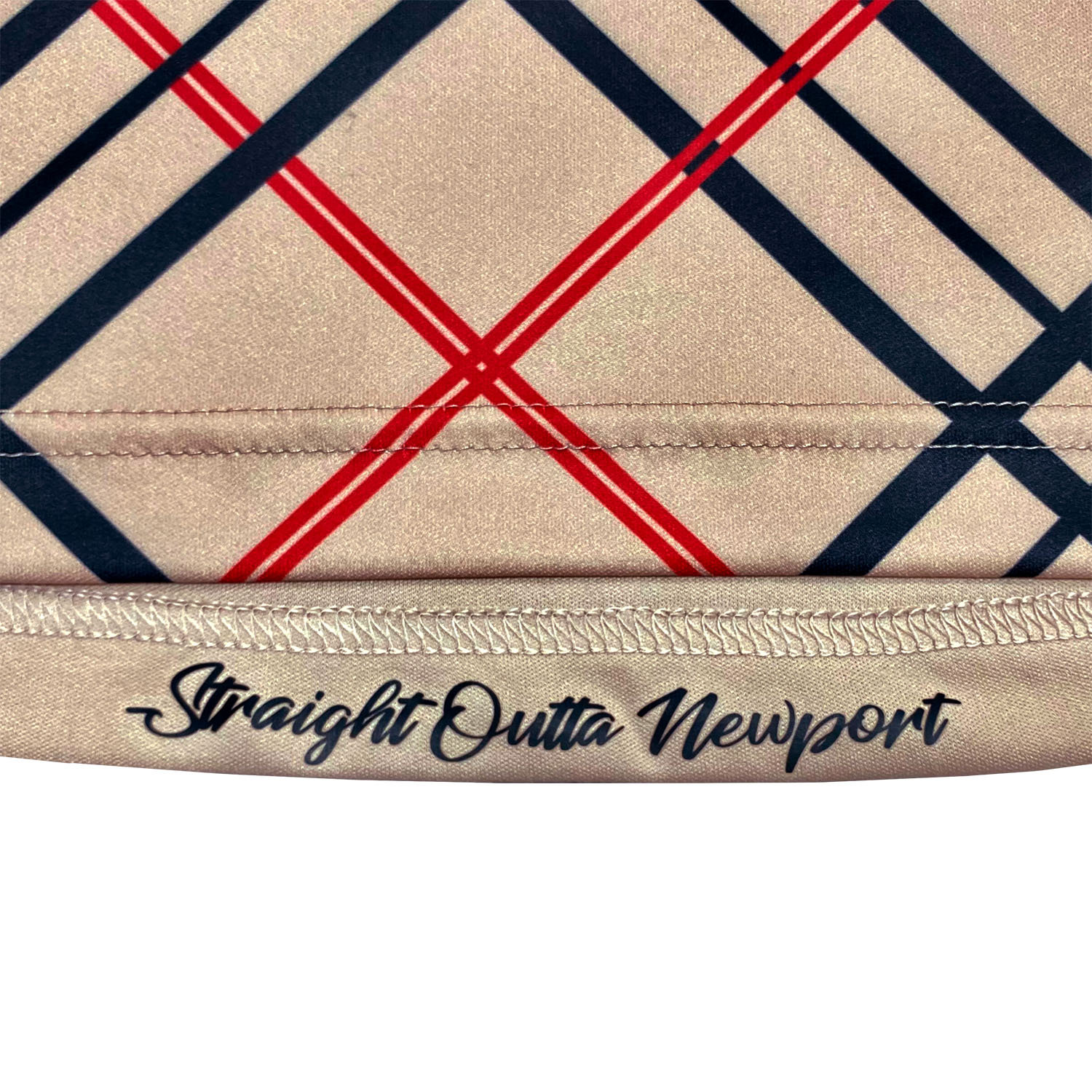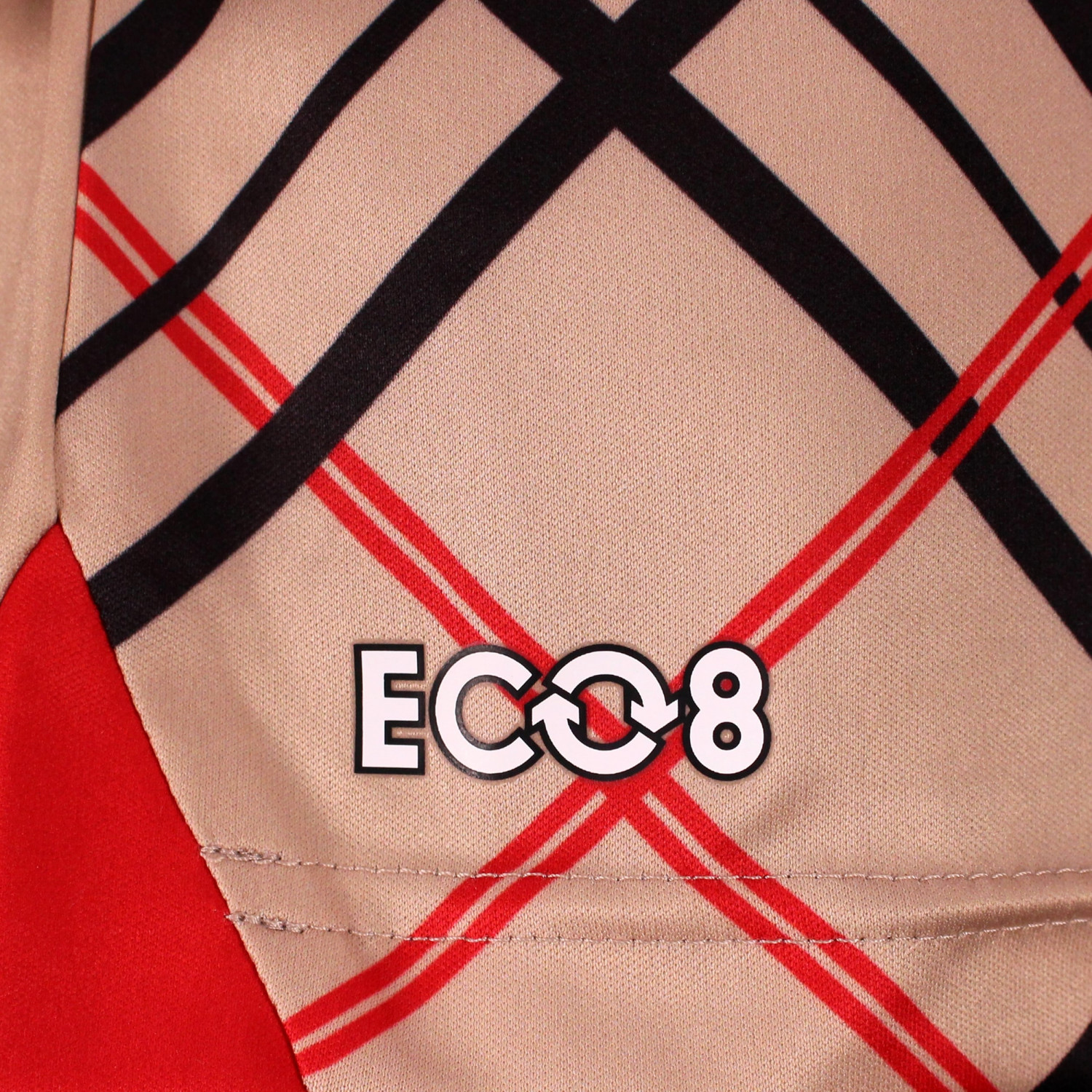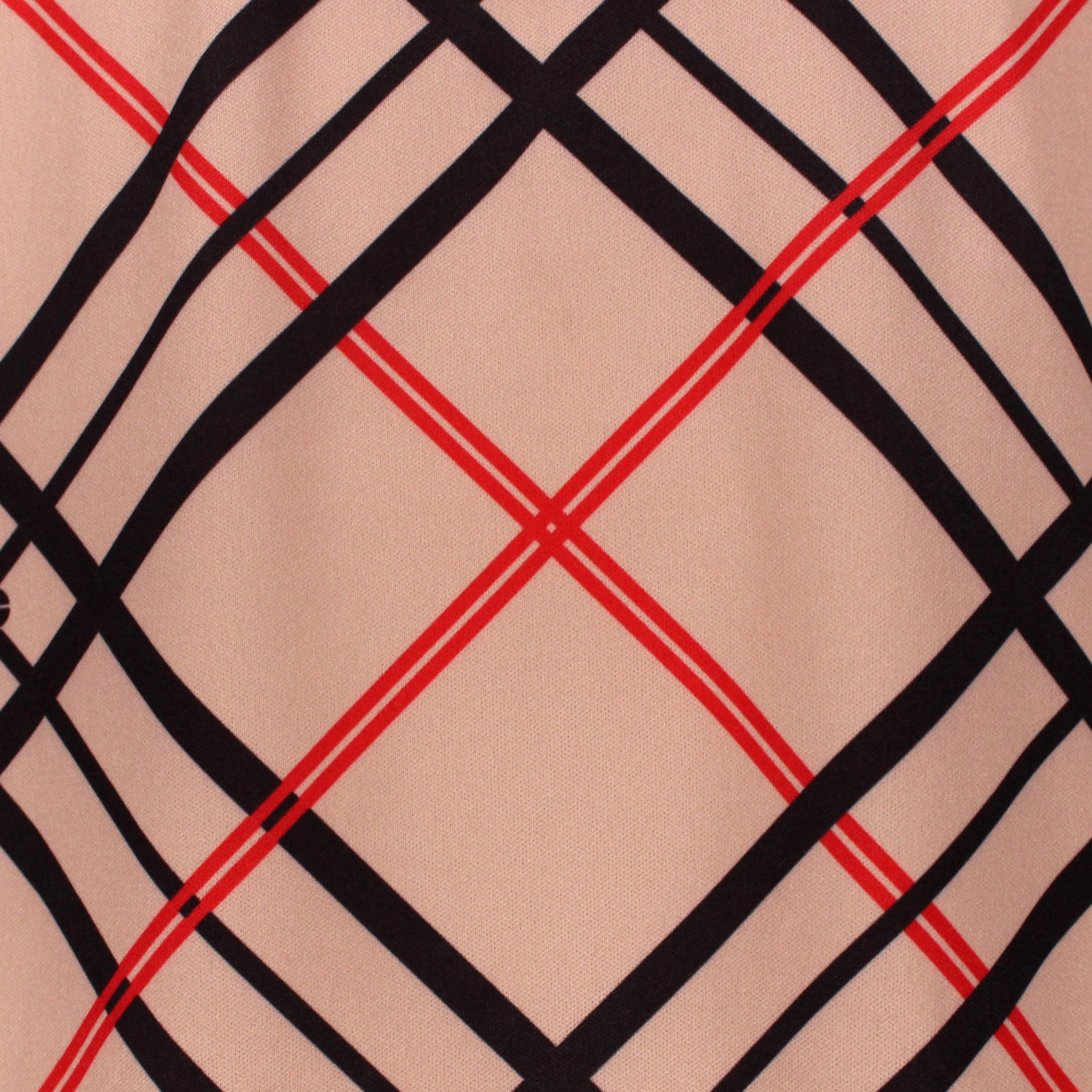 The design is predominantly sesame and consists of a check pattern, which is made up of red and black lines across the front of the shirt.