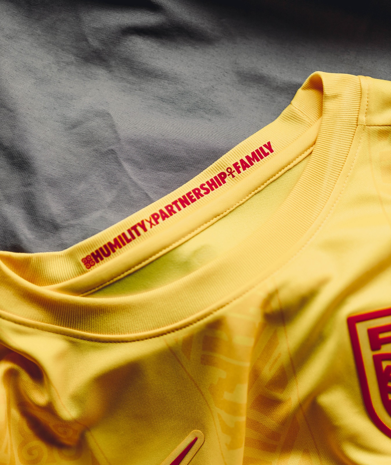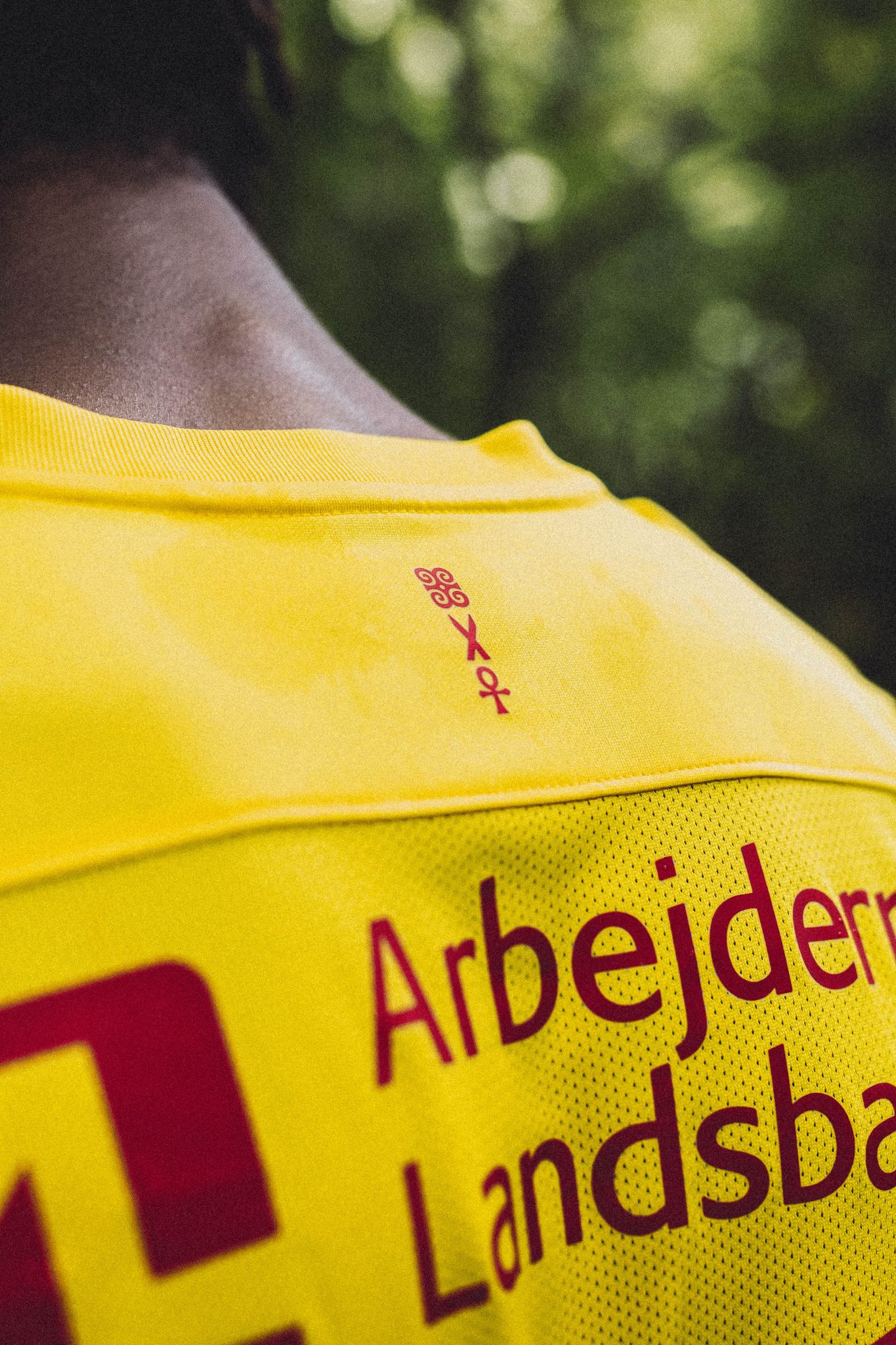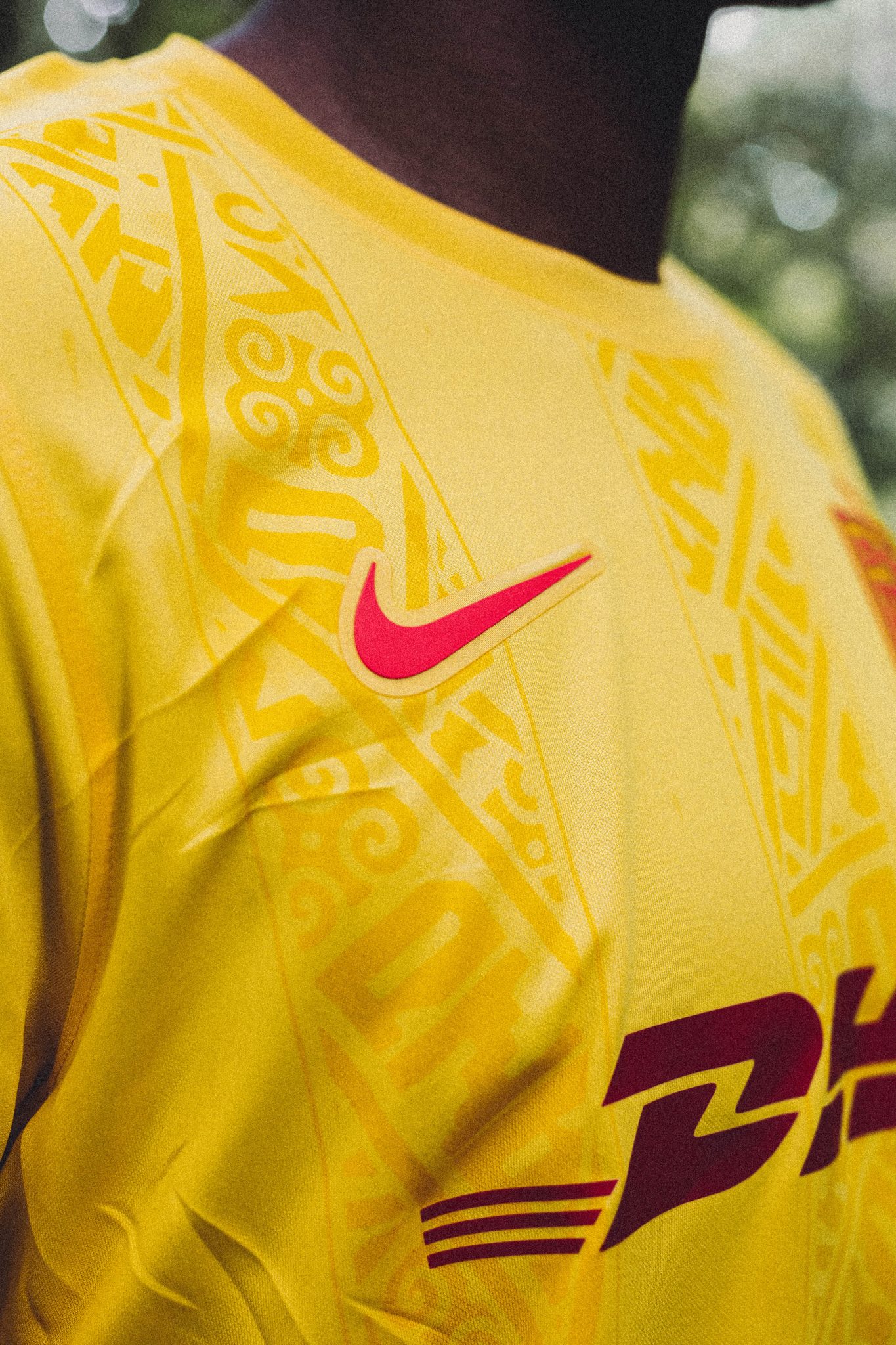 The simple yellow Nike design is heavily embellished with both tonal and red detailing which references the fraternity between Denmark, Ghana and Egypt, and also the shared values of “Humility, Partnership [and] Family”.