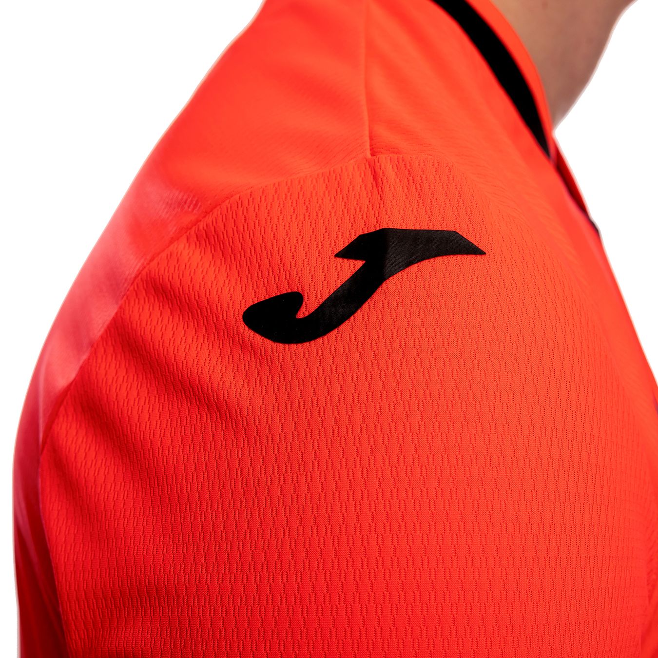 The shirt also has a smart black and fluorescent collar V-neck and sleeve trim detailing.