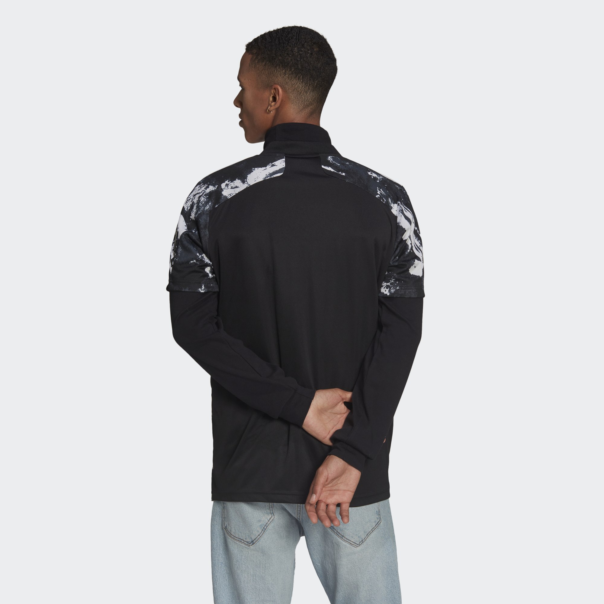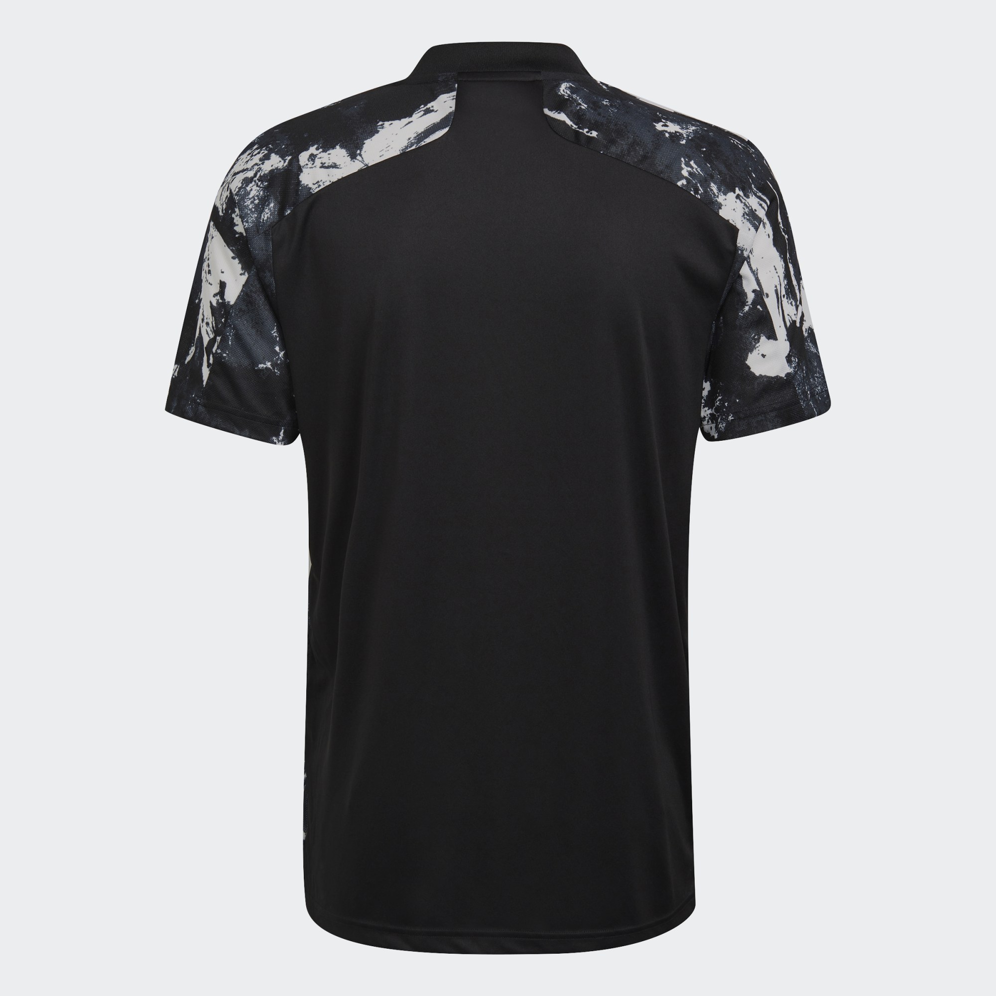 The adidas design for the giants of French football is essentially in greyscale, with the paint-scatter patterning overlaid with standard detailing on the front and the back of the trunk in black.