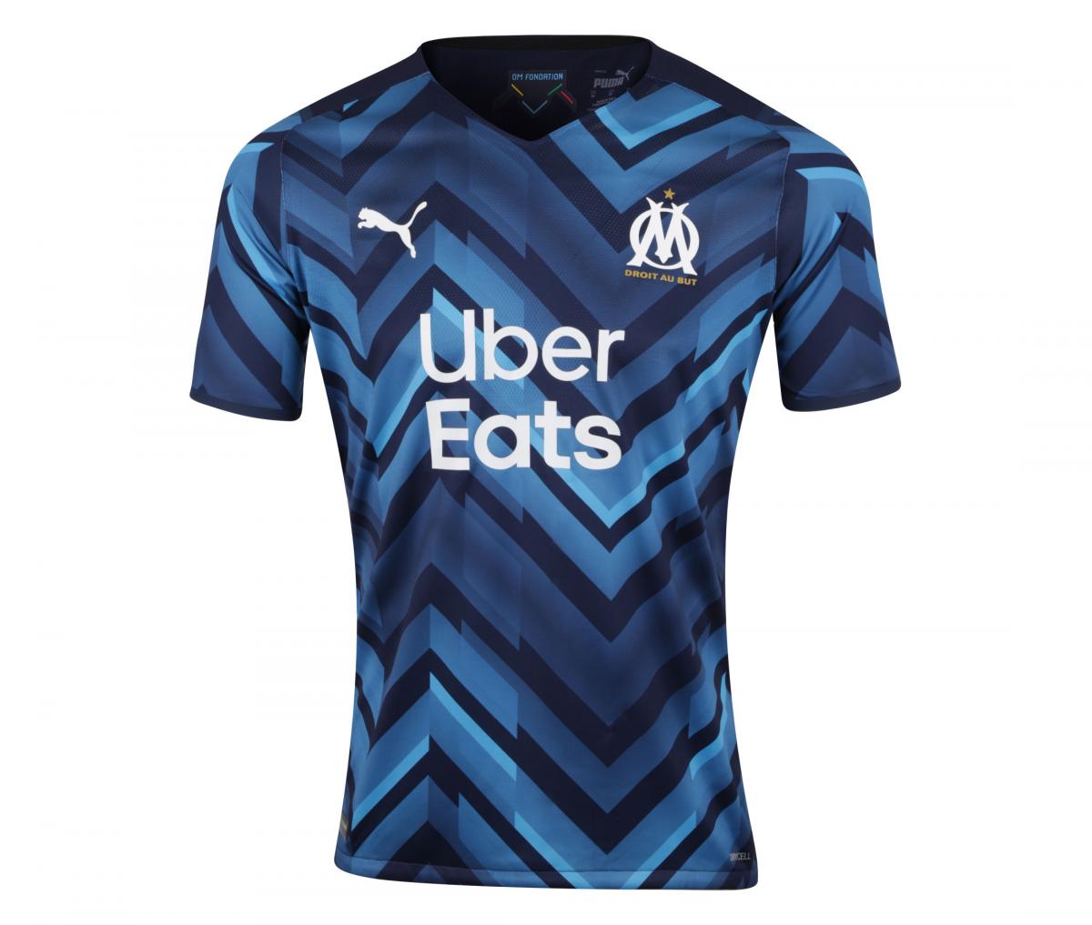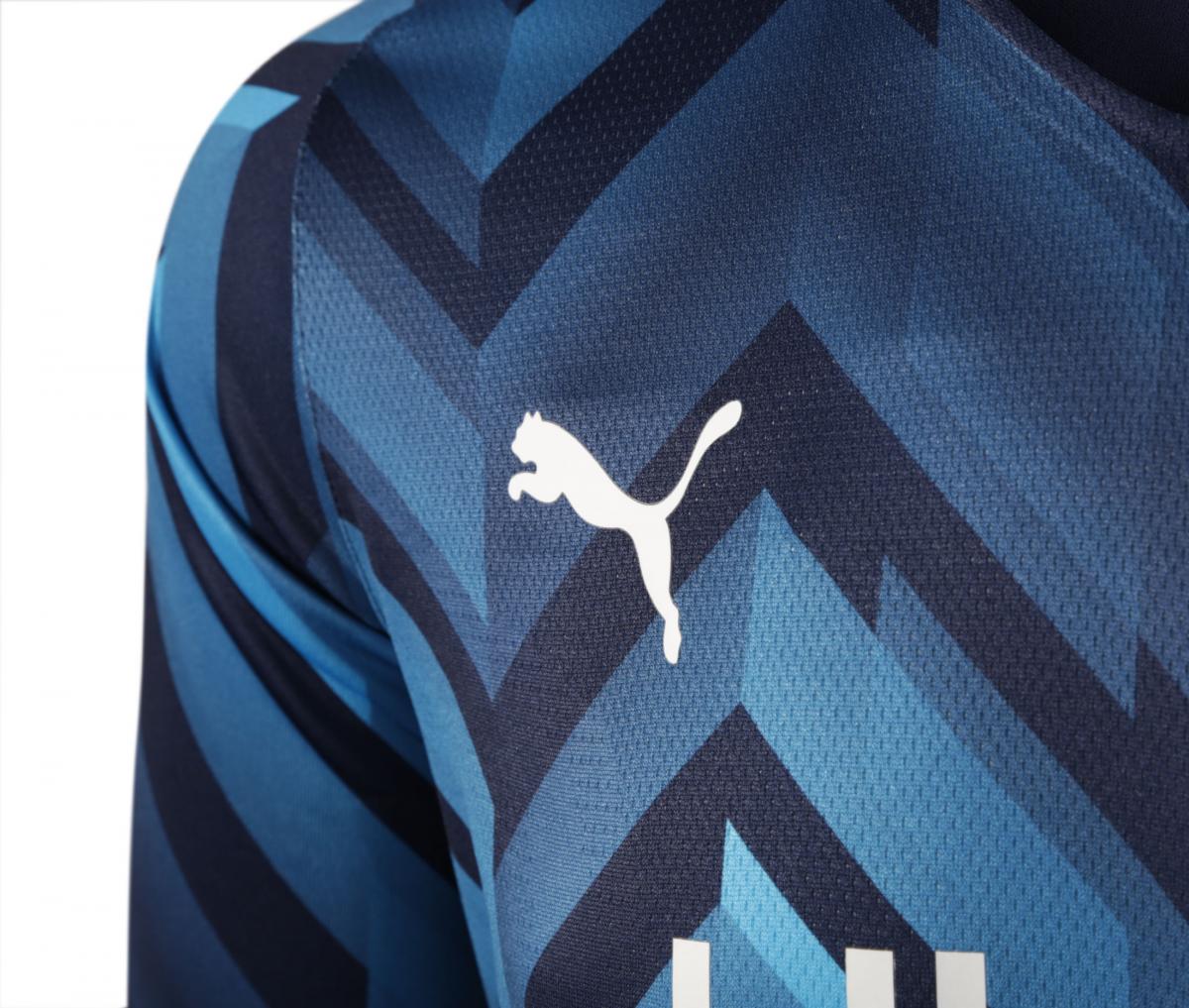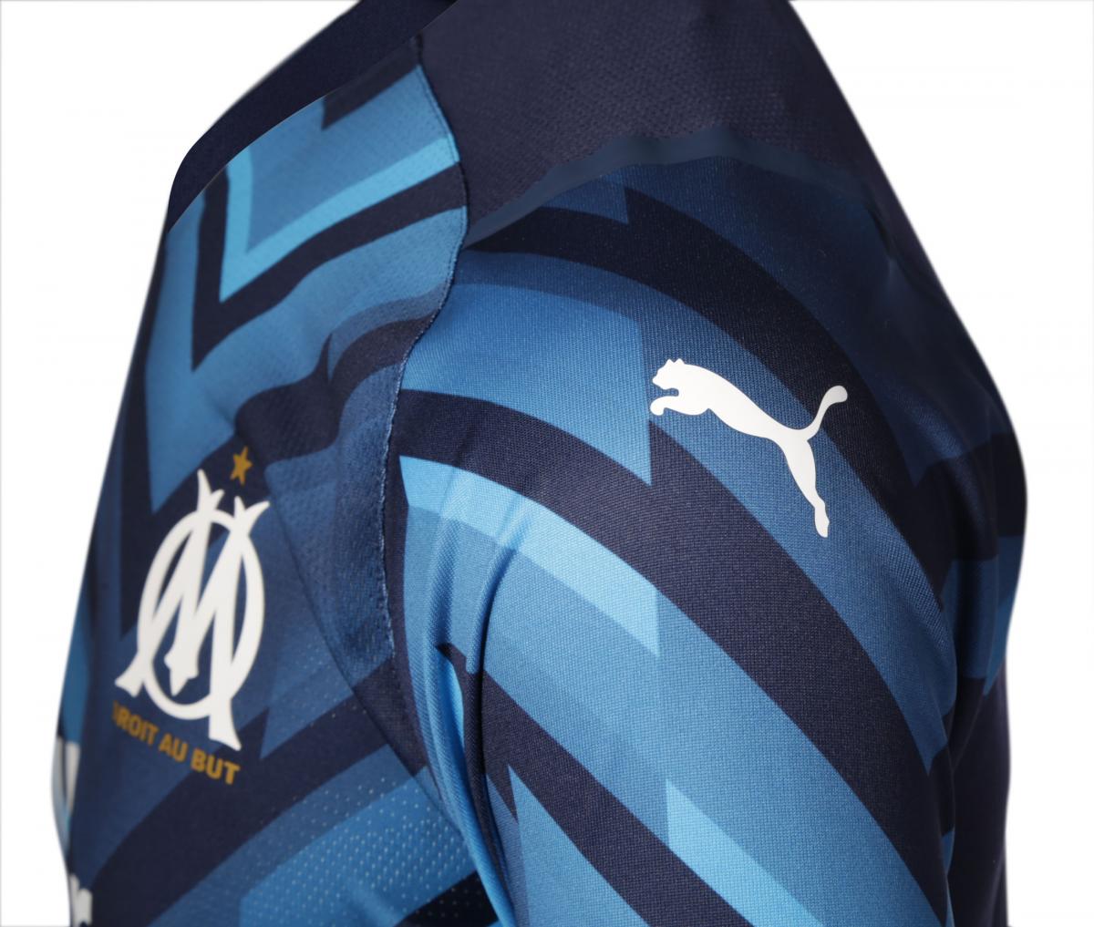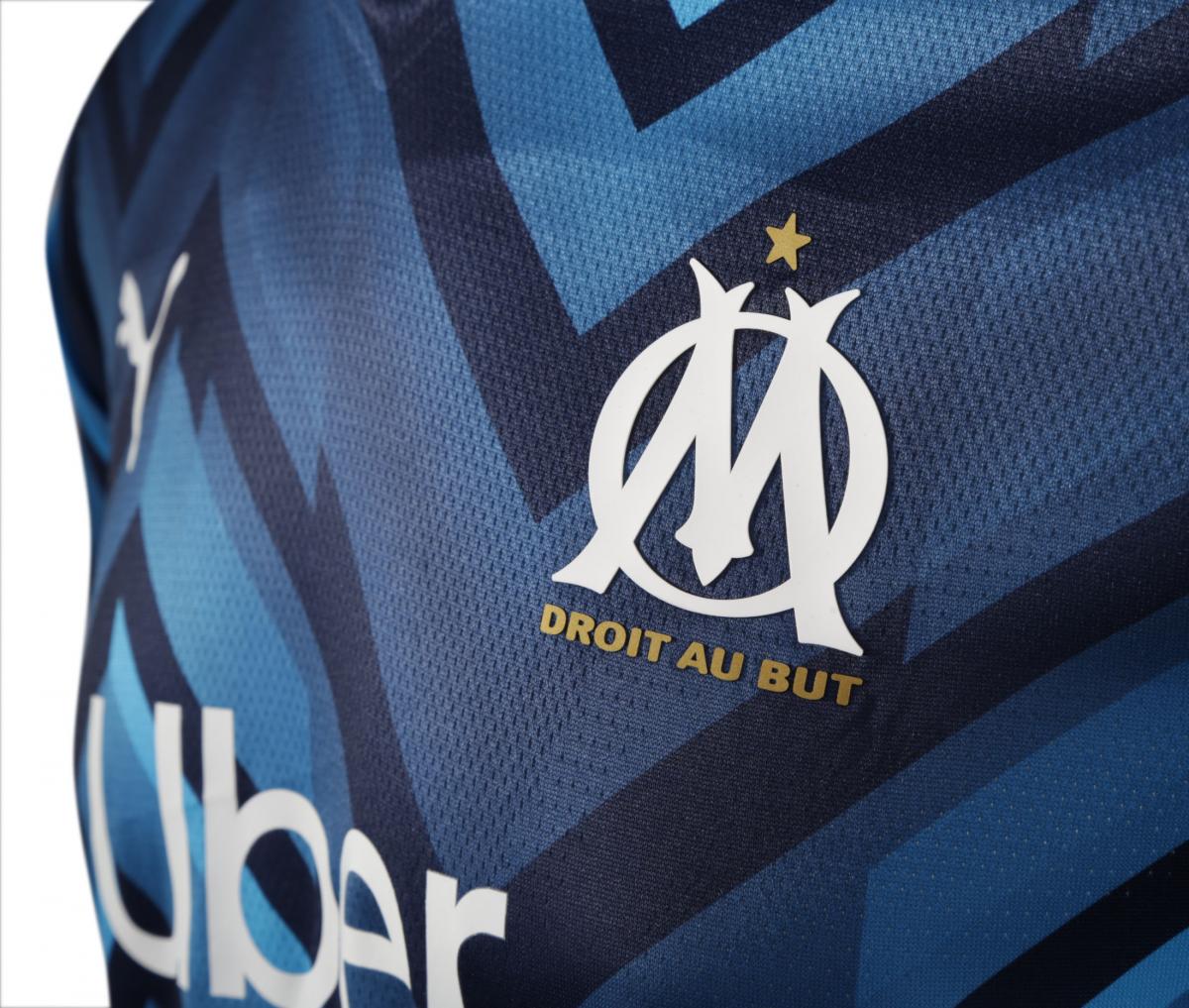 The Puma design for 2021-22 features, on its navy base, a tonal graphic which pays tribute to the “Riviera” coast in its stylings, whilst also being the letter M (for “Marseille”) repeated to denote the four pillars of the club’s “OM Fo(u)ndation” social enterprise.