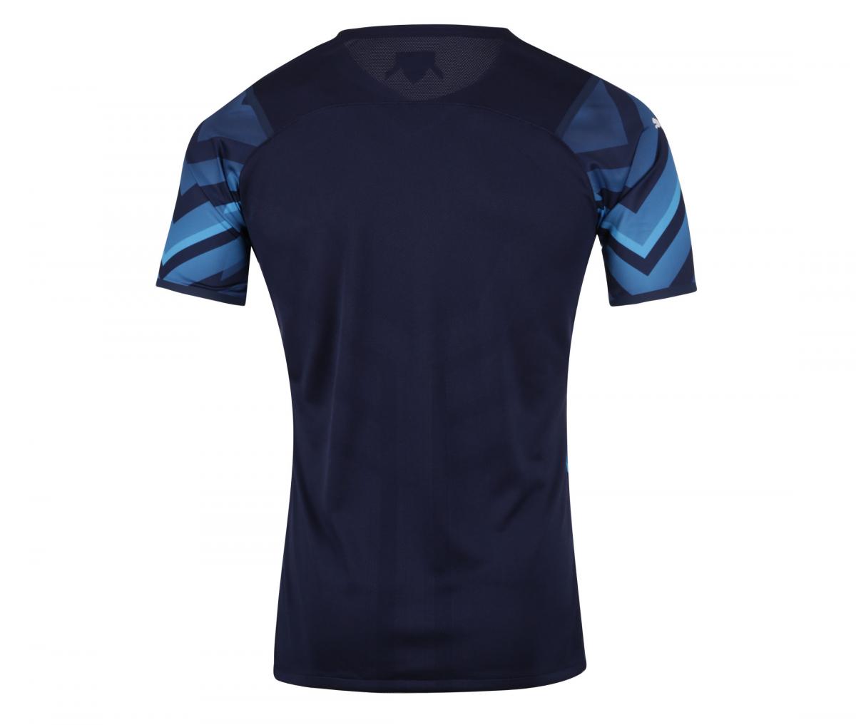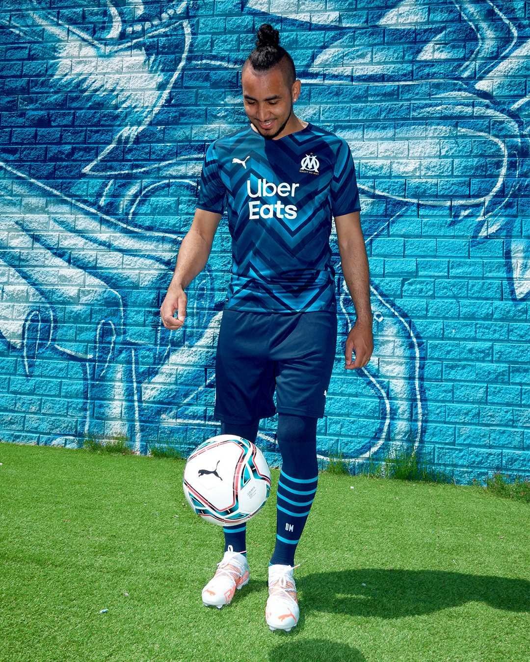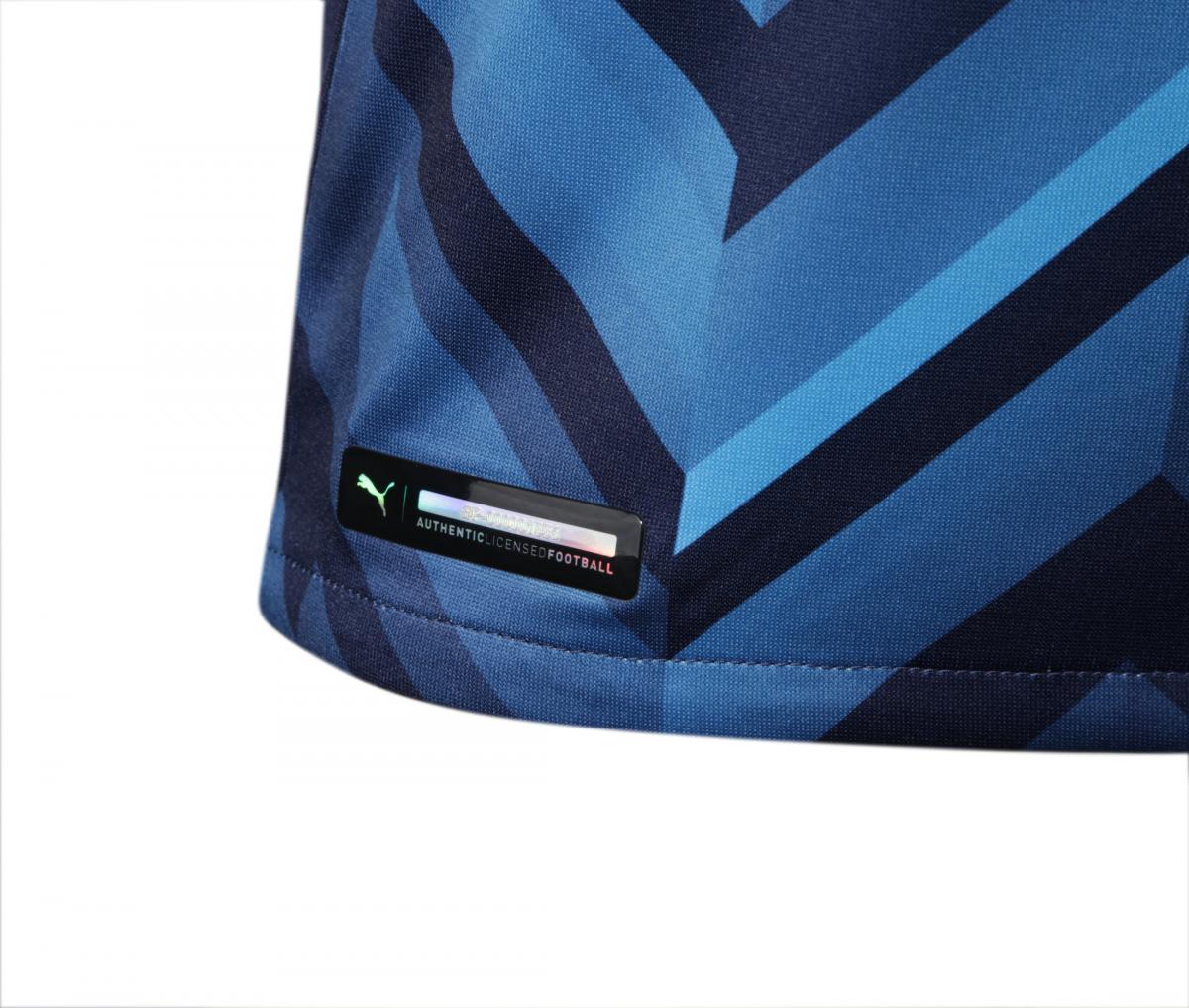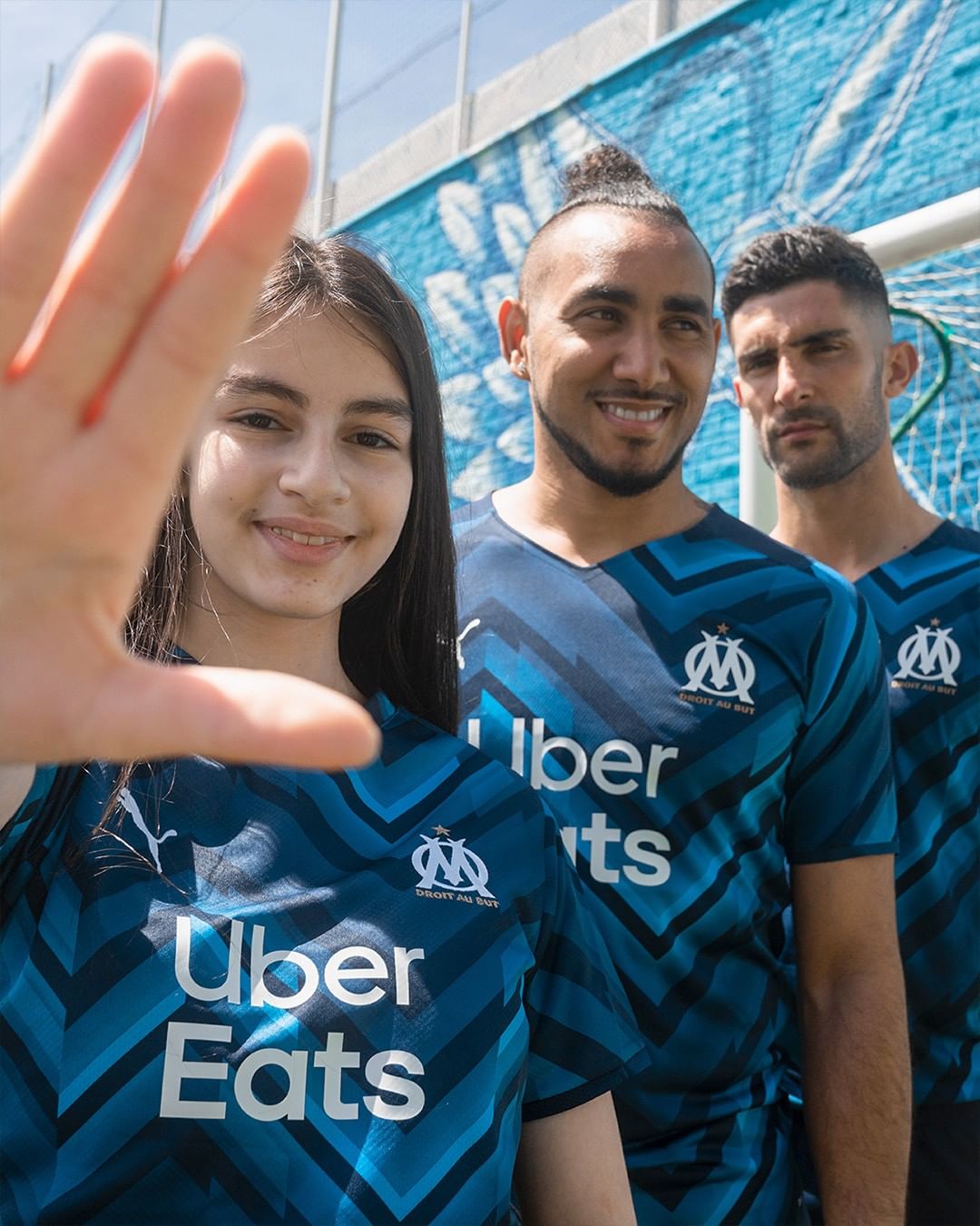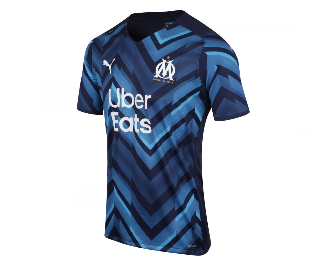 The Puma design for 2021-22 features, on its navy base, a tonal graphic which pays tribute to the “Riviera” coast in its stylings, whilst also being the letter M (for “Marseille”) repeated to denote the four pillars of the club’s “OM Fo(u)ndation” social enterprise.