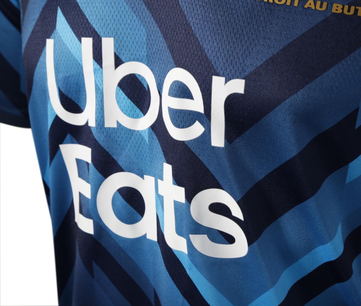 The crest contrasts fully in white and gold while the Puma logos and “Uber Eats” sponsorship branding are also in white.
