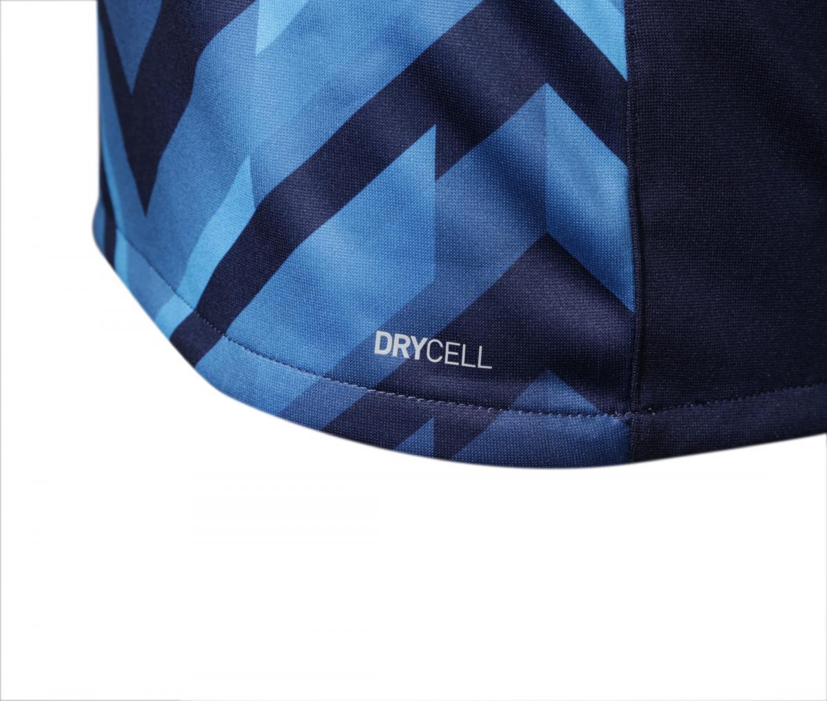 Completing the kit, the shorts and socks are navy, with the latter also featuring blue banding.