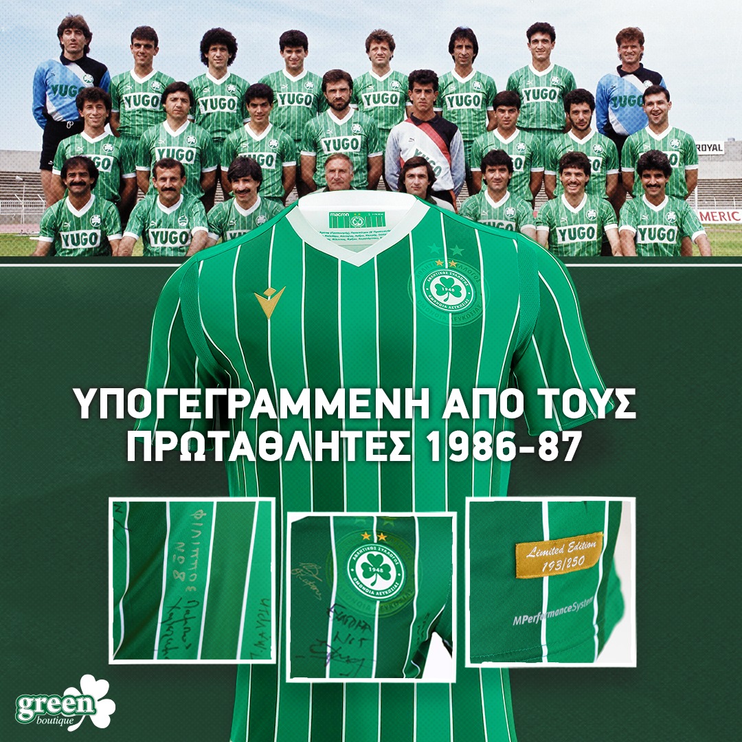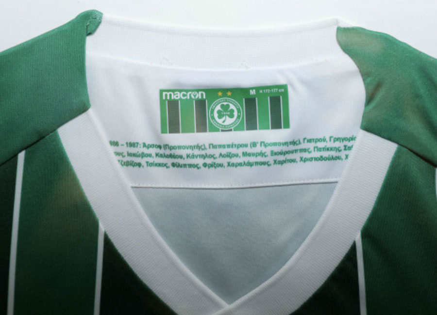 The backneck is personalized with the club colors and crest and the names of the 1986-1987 Omonoia FC formation, including the names of the then head coach and of his assistant coach. Along the bottom, the internal tape quotes a portion of the team anthem in Greek (Και του ΛΑΟΥ ομάδα…OMONOIA, OMONOIA, OMONOIA).