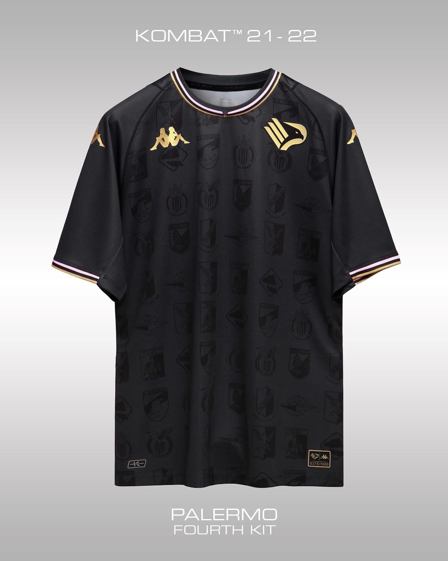 In basic terms, the nominally-tertiary change Kappa “Kombat Pro” release is in black with golden embellishment, but it does also carry the iconic pink as trim on the crew neck and cuffs, and the base contains an array of sublimated images.