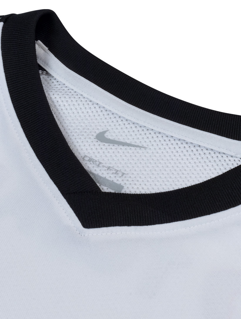 The Nike-designed strip features a white shirt with black and claret shoulder flashes. It also includes gold side mesh panels and is complemented by black shorts and white socks.