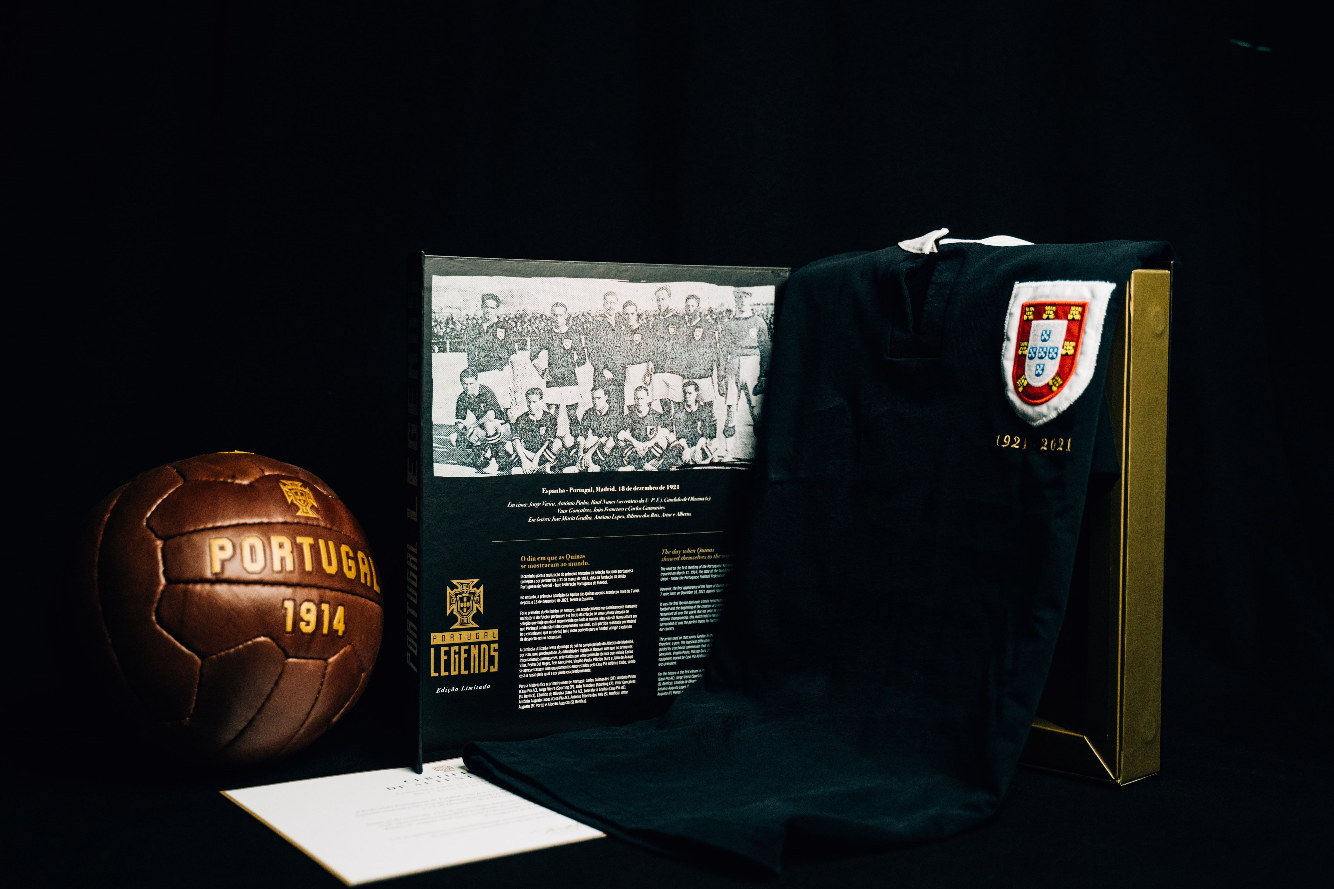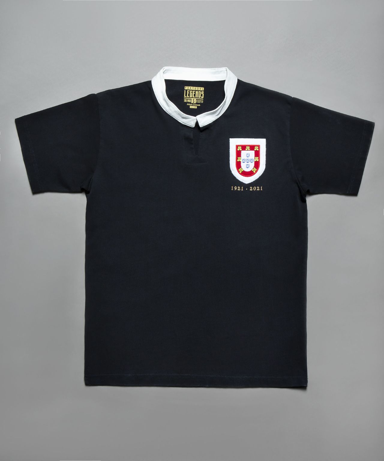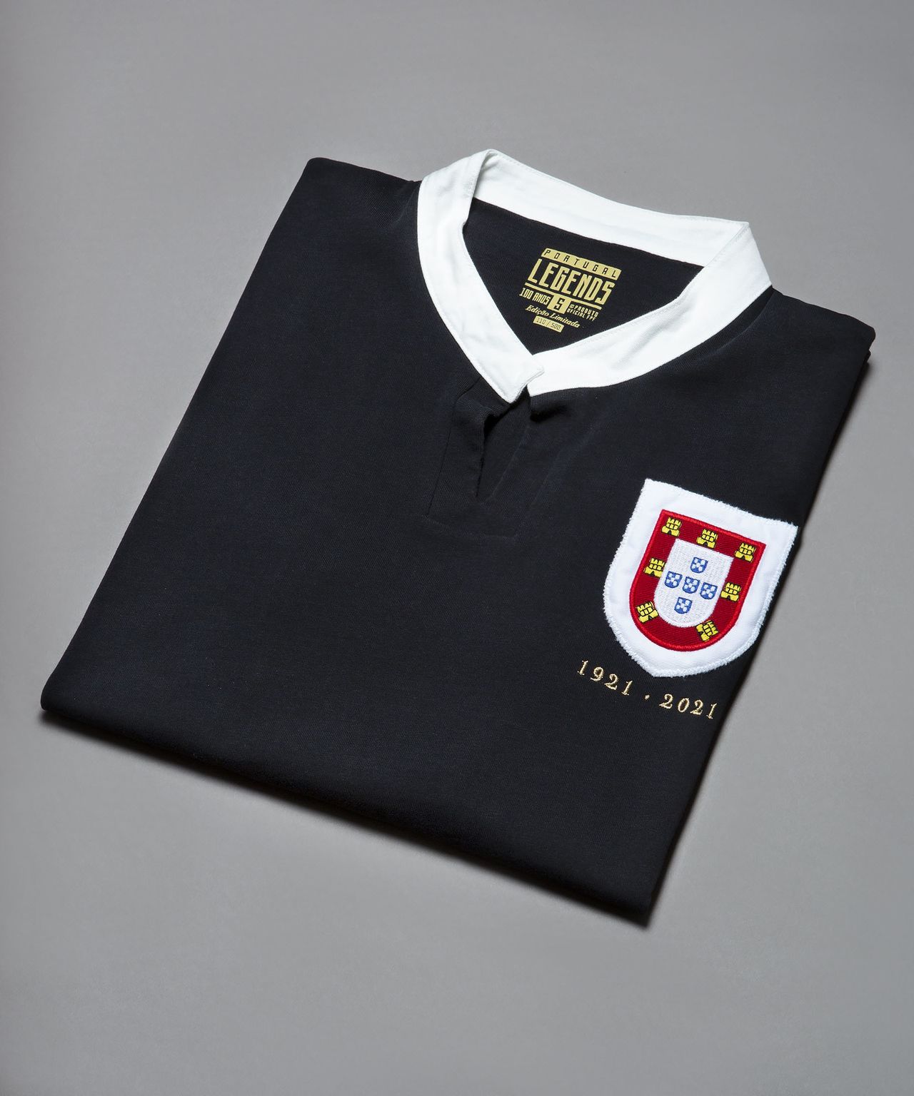 The black shirt with white neck trim is a modern approximation of the version worn when the representative side for the now Federação Portuguesa de Futebol - the Portuguese Football Federation - took on Spain in Madrid in 1921.