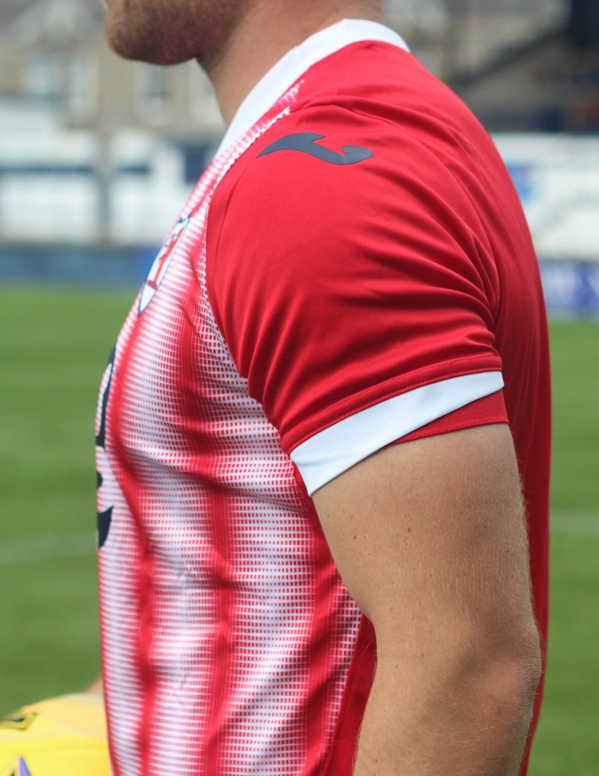 The kit, manufactured by Joma, features a red-and-white candy stripe design, red shorts and red socks.