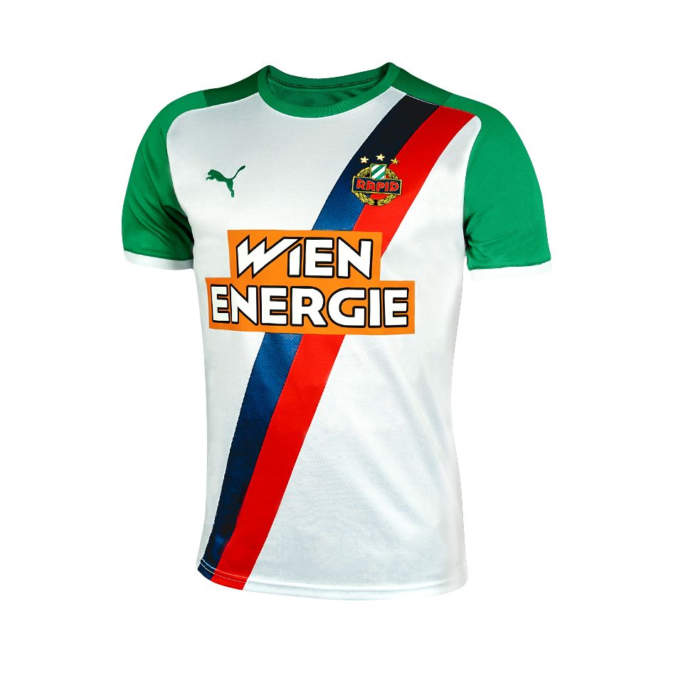 Now kitted out by Puma, the Viennese side have been provided with a design consisting of a white trunk with a diagonal red and blue sash and green, stylised raglan sleeves.