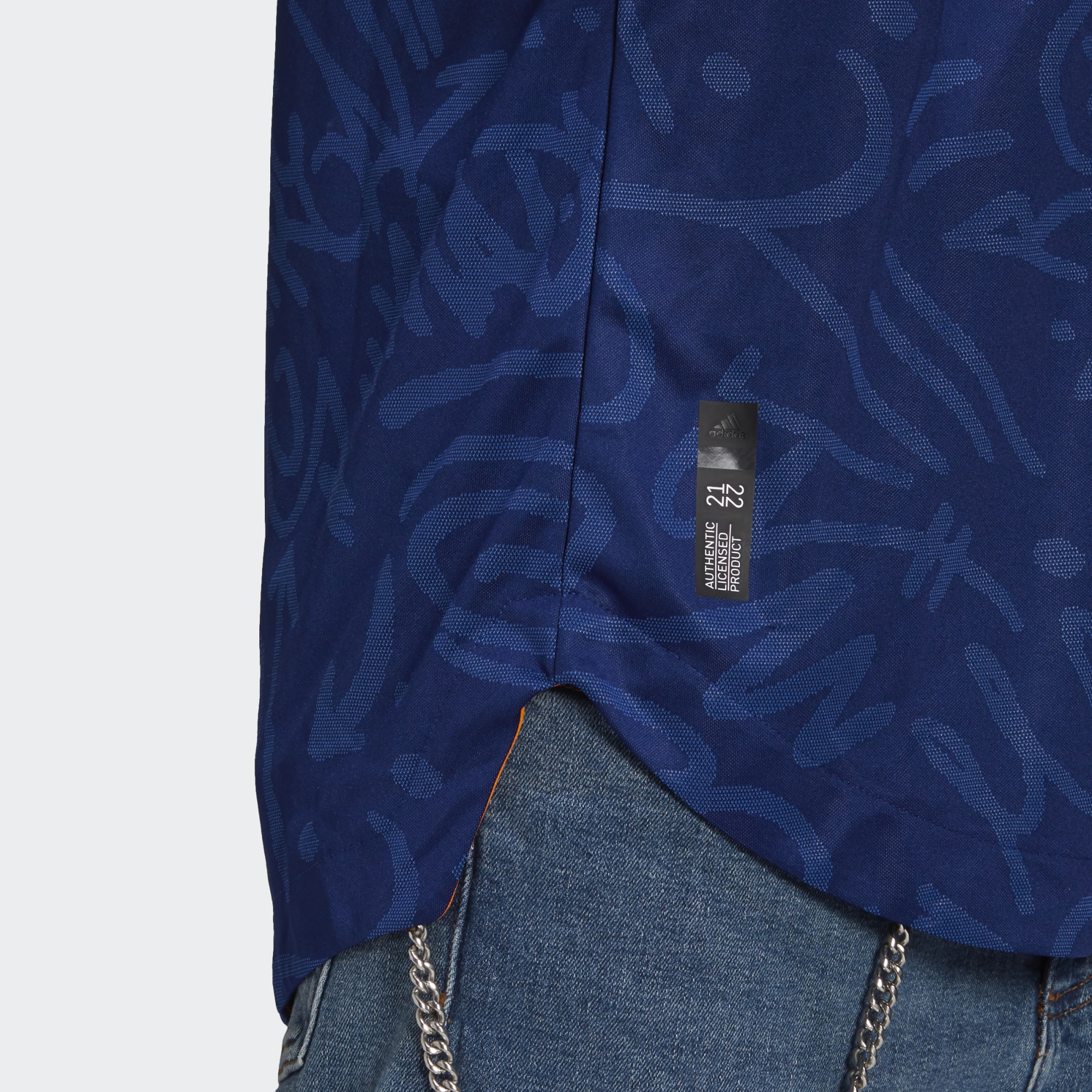 The jersey comes in blue, which is combined with orange on the collar and the three adidas stripes, while the logo, sponsor and crest appear in white.